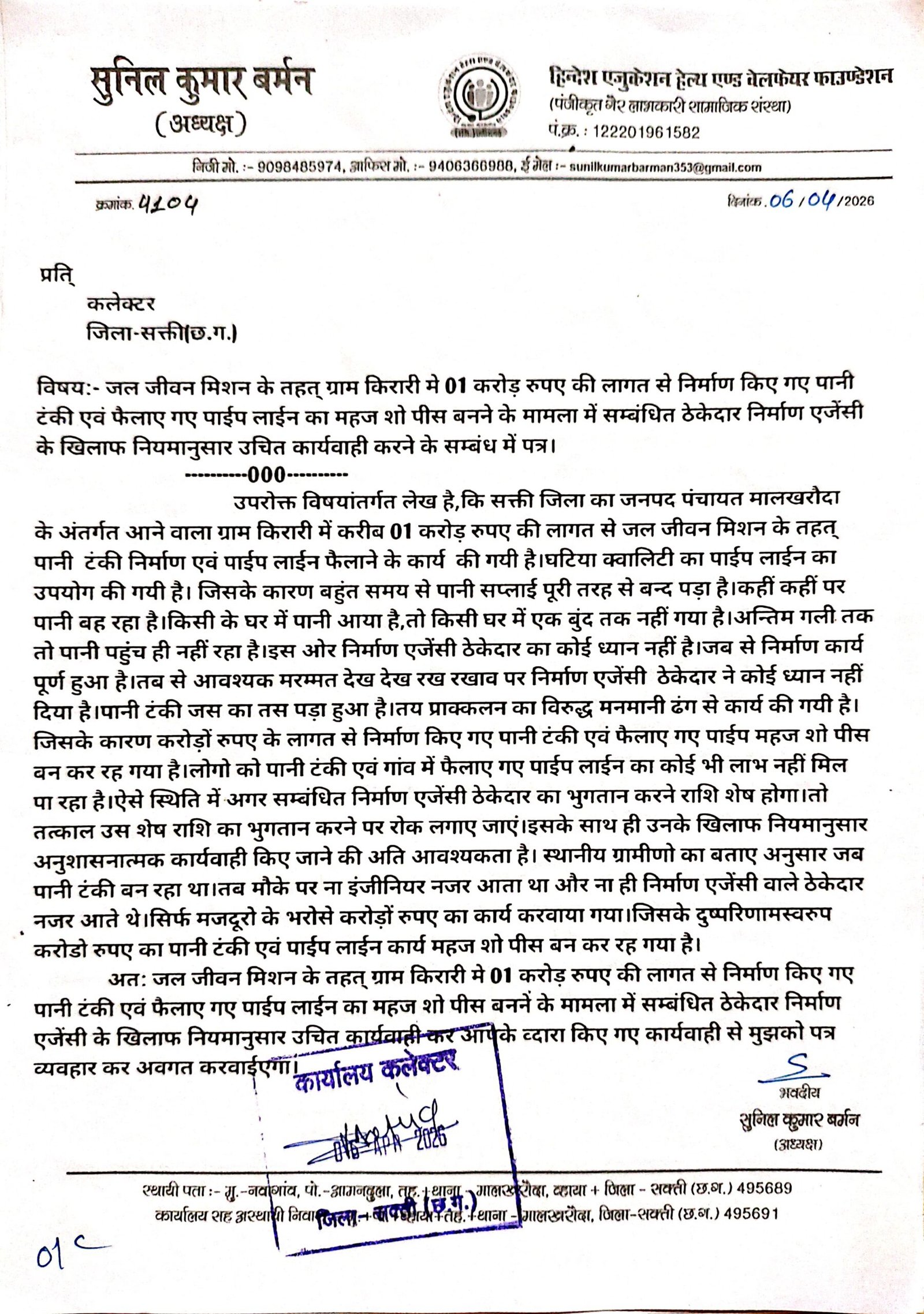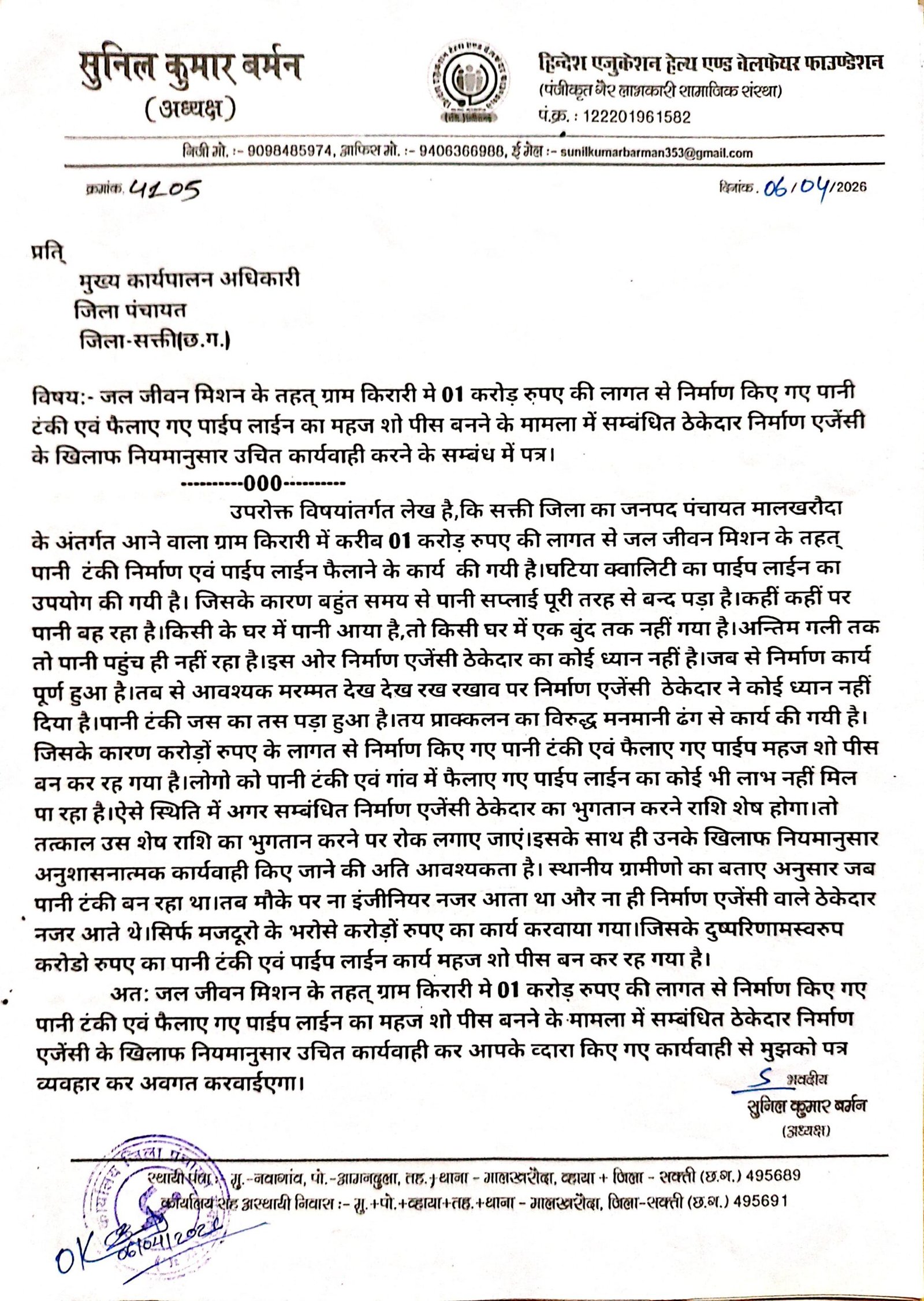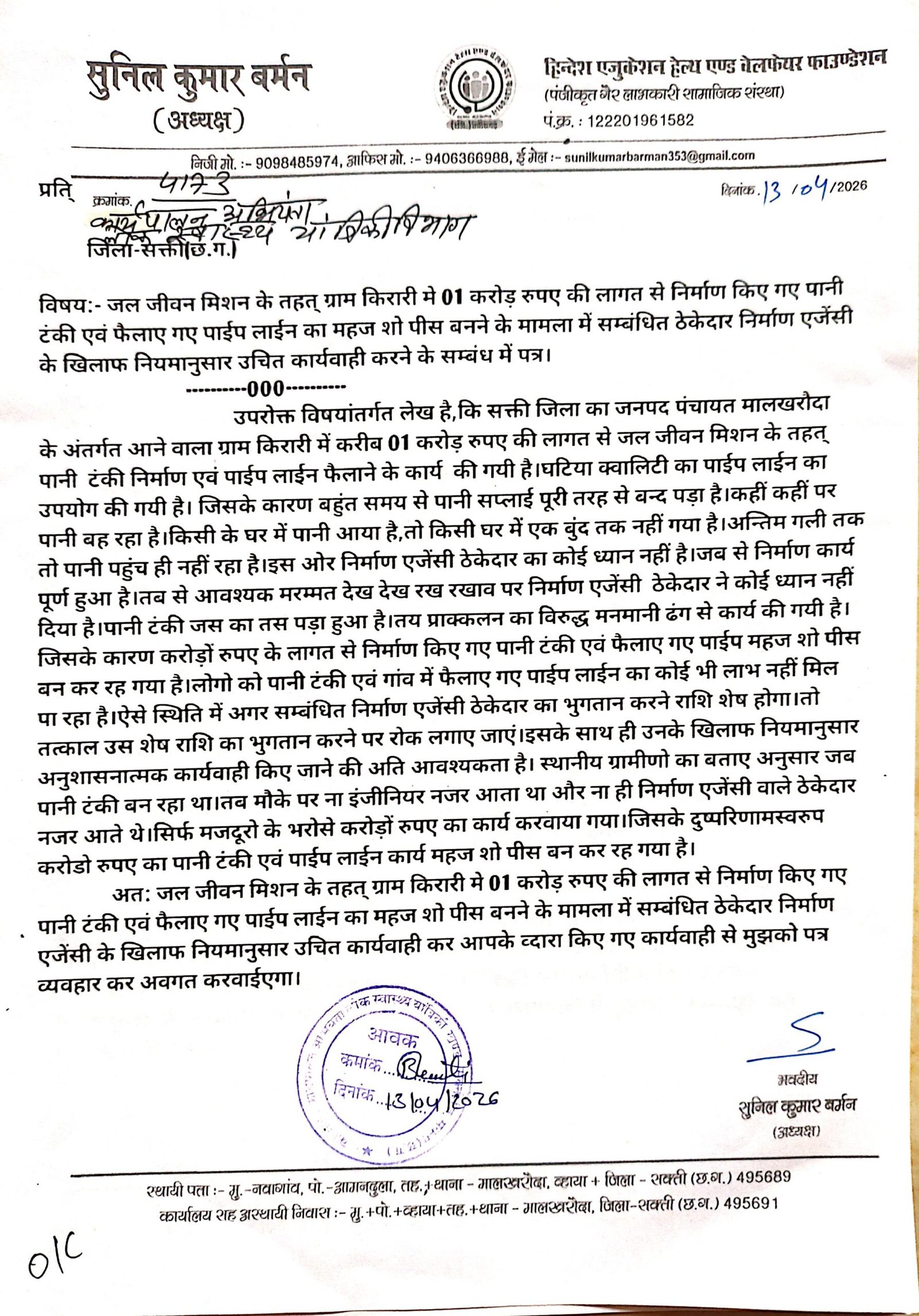 मालखरौदा-सक्ती(एचकेपी 24 न्यूज)।जल जीवन मिशन के तहत् ग्राम किरारी मे 01 करोड 15 लाख रुपए की लागत से निर्माण किए गए पानी टंकी एवं फैलाए गए पाईप लाईन का आवश्यक देख रेख रख रखाव का अभाव मे महज शो पीस बन कर रह जाने के मामला में सम्बंधित ठेकेदार निर्माण एजेंसी के खिलाफ नियमानुसार उचित कार्यवाही करने एवं शो पीस बने पानी टंकी को जनहित का दृष्टिकोण से उपयोगी साबित करवाने नियमानुसार उचित कार्यवाही करने हिन्देश एजुकेशन हेल्थ एण्ड वेलफेयर फाउण्डेशन के अध्यक्ष सुनिल कुमार बर्मन ने कलेक्टर,सीईओ जिला पंचायत एवं कार्यपालन अभियंता लोक स्वास्थ्य यांत्रिकी विभाग को पत्र लिखा है।