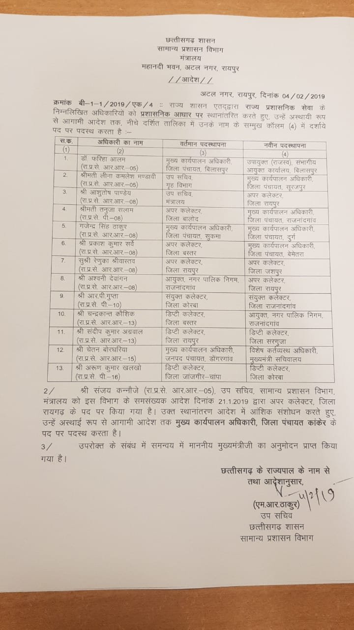रायपुर(एचकेपी 24 न्यूज)।राज्य प्रशासनिक सेवा के 13 अधिकारियों का स्थानांतरण आदेश जारी की गयी है।सोमवार 4 फरवरी को जारी हुए इस आदेश में राज्य प्रशासनिक सेवा के अधिकारियों में ज्यादातर डिप्टी कलेक्टर और अपर कलेक्टरों का स्थानांतरण की गयी है।मंत्रालय में उप सचिव आशुतोष पांडे को रायपुर का अपर कलेक्टर बनाया है।बस्तर में डिप्टी कलेक्टर रहे चंद्रकांत कौशिक को राजनांदगांव नगर निगम का कमिश्नर बनाया गया है।