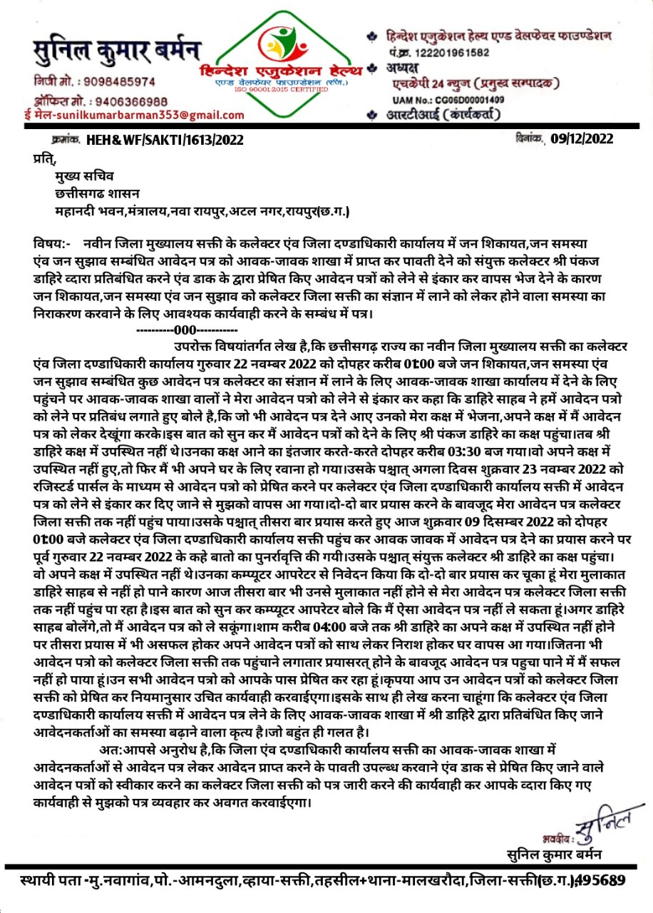 सक्ती(एचकेपी 24 न्यूज)।नवीन जिला मुख्यालय सक्ती के कलेक्टर एंव जिला दण्डाधिकारी कार्यालय में जन शिकायत,जन समस्या एंव जन सुझाव सम्बंधित आवेदन पत्र को आवक-जावक शाखा में प्राप्त कर पावती देने को संयुक्त कलेक्टर पंकज डाहिरे व्दारा प्रतिबंधित करने एंव डाक के द्वारा प्रेषित किए गए आवेदन पत्रों को लेने से इंकार कर वापस भेज देने के कारण जन शिकायत,जन समस्या एंव जन सुझाव को कलेक्टर जिला सक्ती का संज्ञान में लाने को लेकर होने वाला समस्या का निराकरण करवाने के लिए आवश्यक कार्यवाही करने हिन्देश एजुकेशन हेल्थ एण्ड वेलफेयर फाउण्डेशन (रजिस्टर्ड)के अध्यक्ष सुनिल कुमार बर्मन ने मुख्य सचिव छत्तीसगढ़ शासन को पत्र लिखा है।