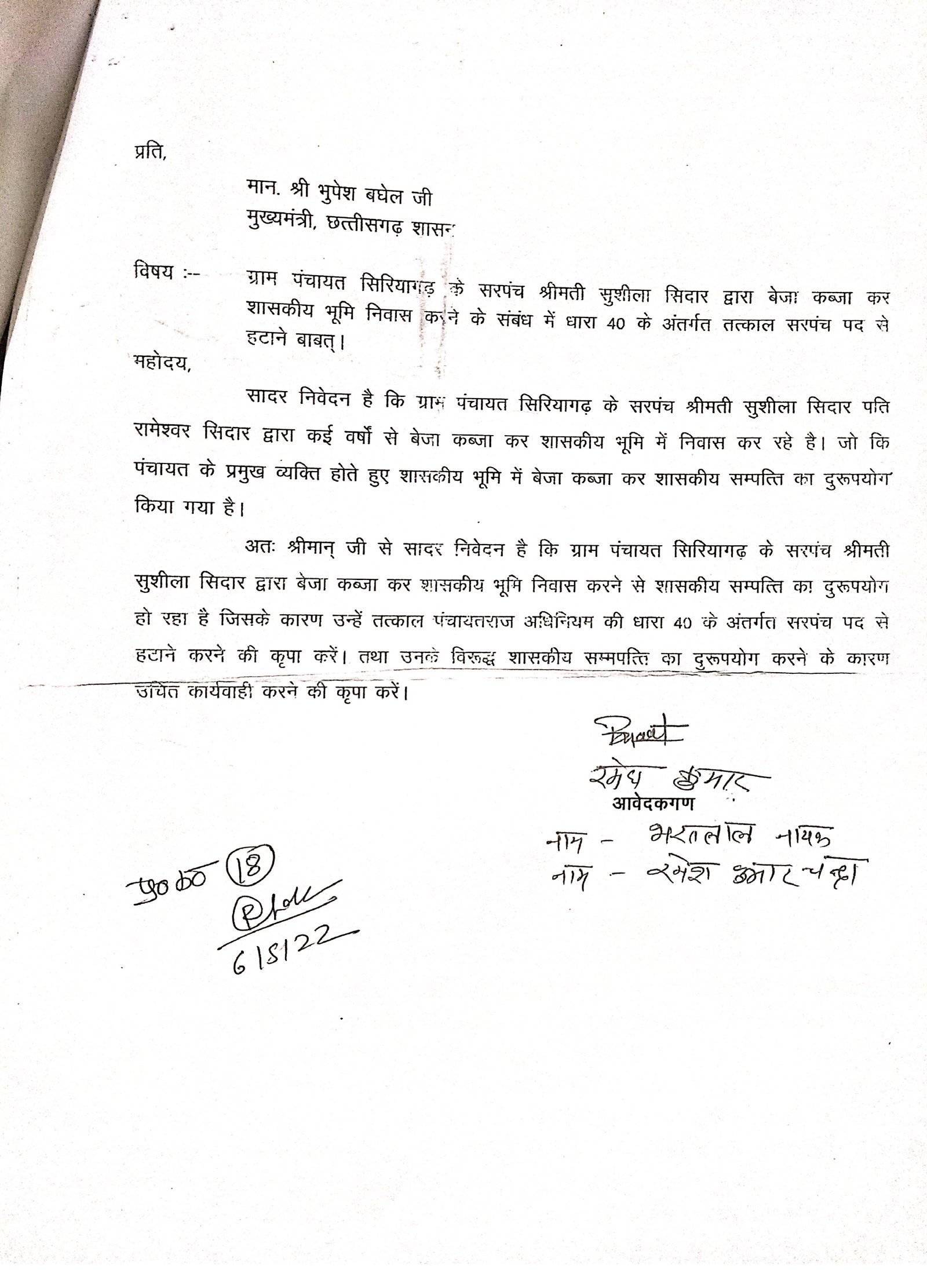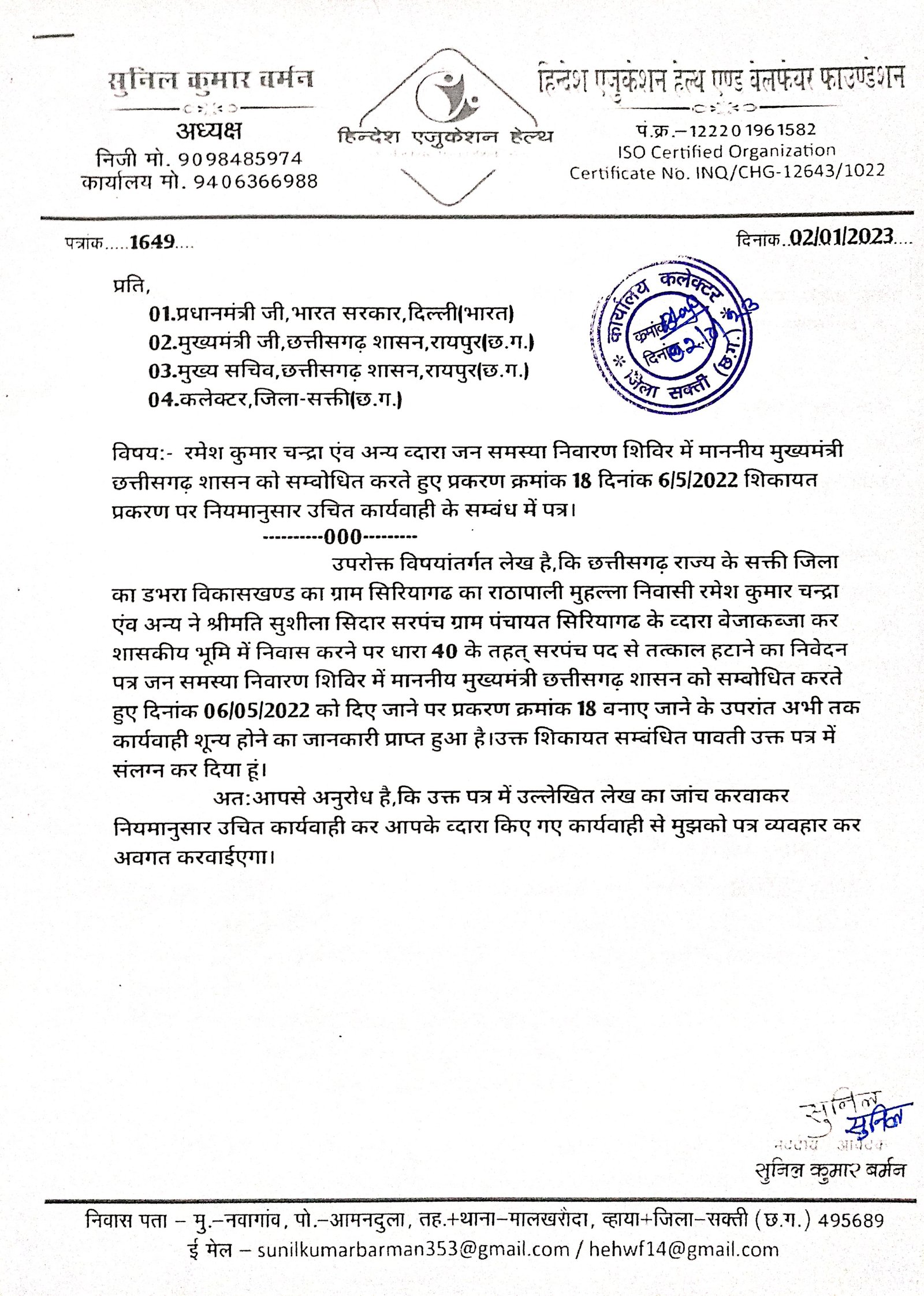डभरा-सक्ती(एचकेपी 24 न्यूज)।सिरियागढ ग्राम पंचायत का सरपंच के व्दारा बेजाकब्जा शासकीय भूमि में मकान बना कर रहने का स्थानीय नागरिकों के व्दारा लिखित रुप से शिकायत जन समस्या निवारण शिविर में किए जाने का 07 माह से भी अधिक समय बीत जाने के बावजूद अभी तक कार्यवाही शून्य होने का जानकारी प्राप्त होने पर उक्त शिकायत प्रकरण का जांच करवाकर नियमानुसार उचित कार्यवाही करने के लिए हिन्देश एजुकेशन हेल्थ एण्ड वेलफेयर फाउण्डेशन(रजिस्टर्ड) के अध्यक्ष सुनिल कुमार बर्मन ने पीएमओ,सीएमओ,सीएस एंव कलेक्टर को पत्र लिखा है।