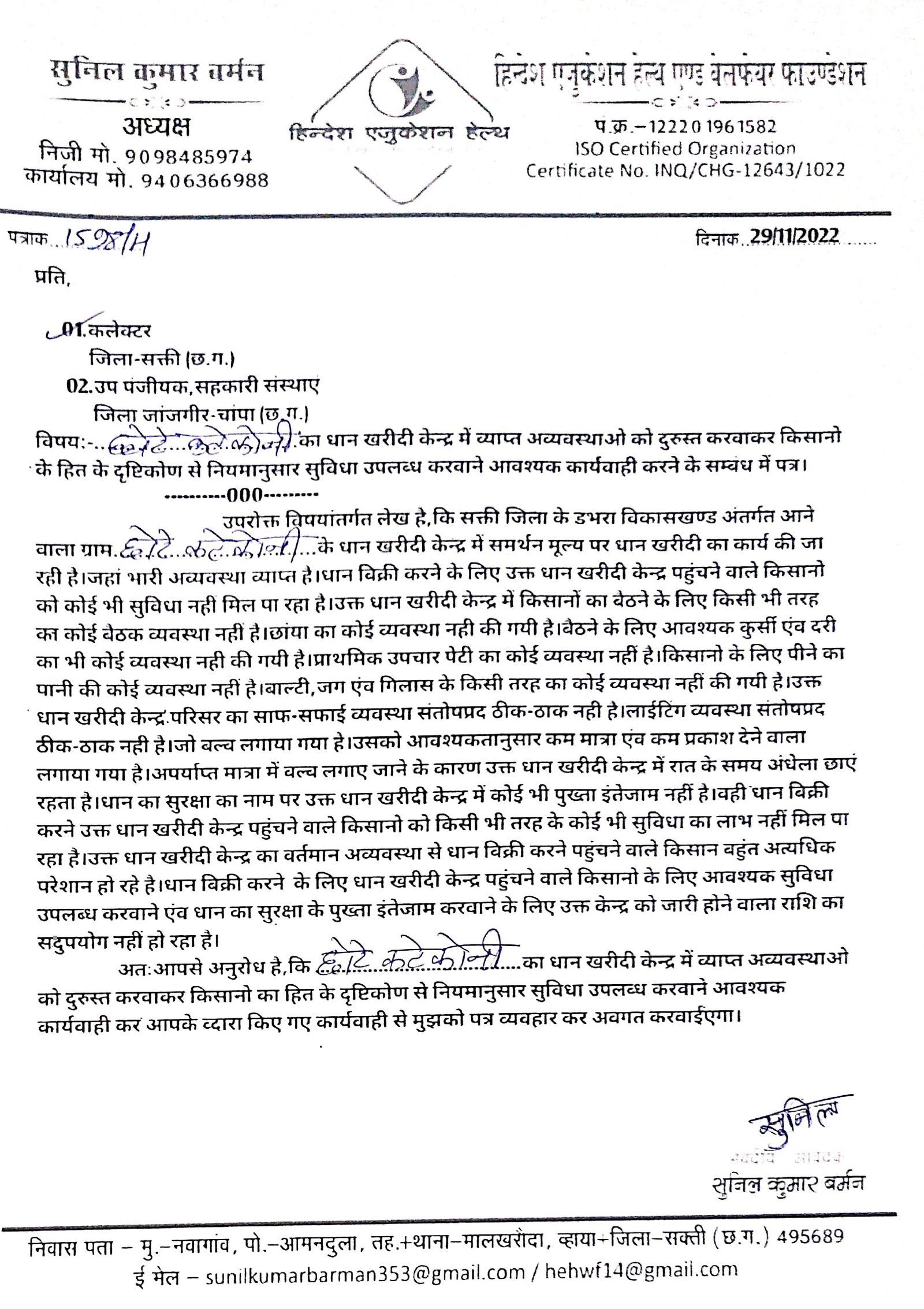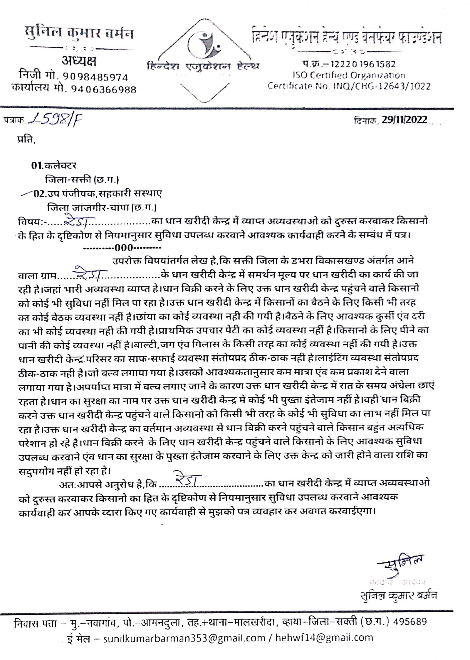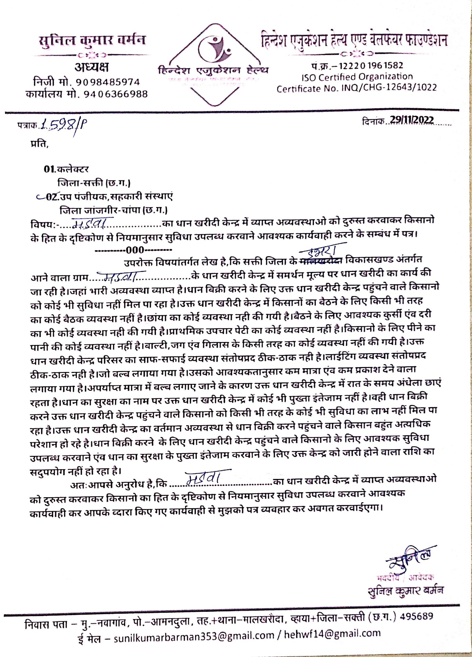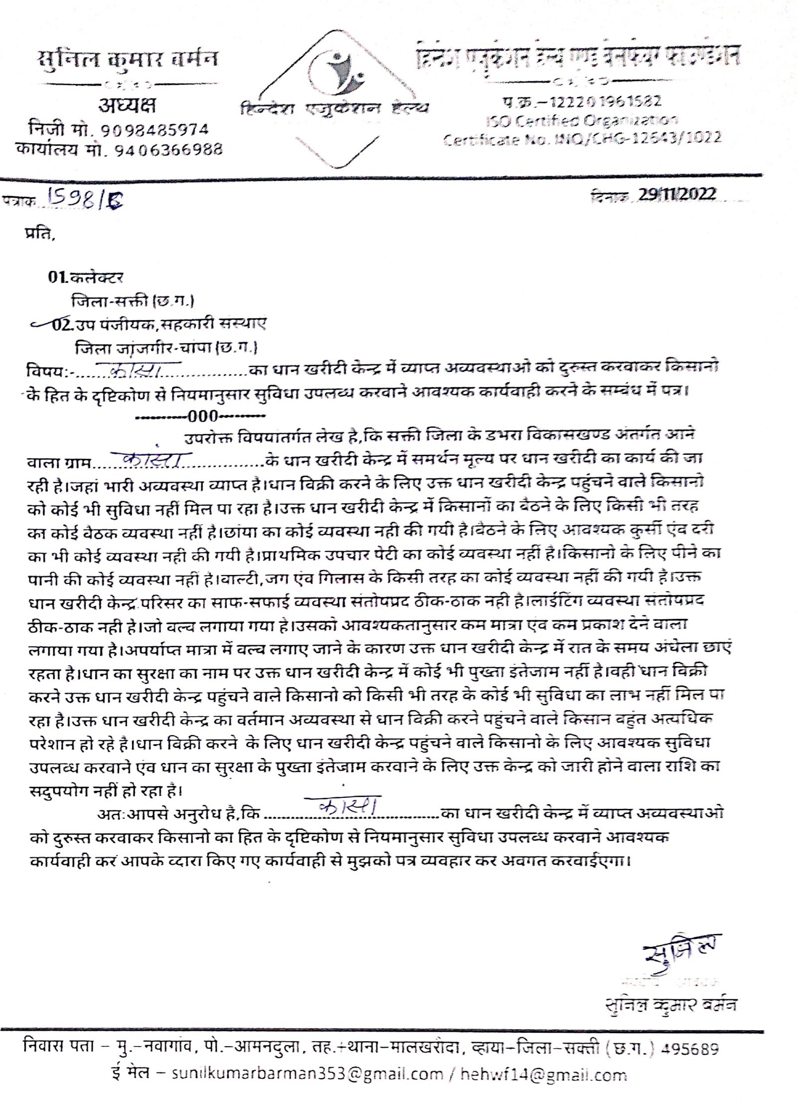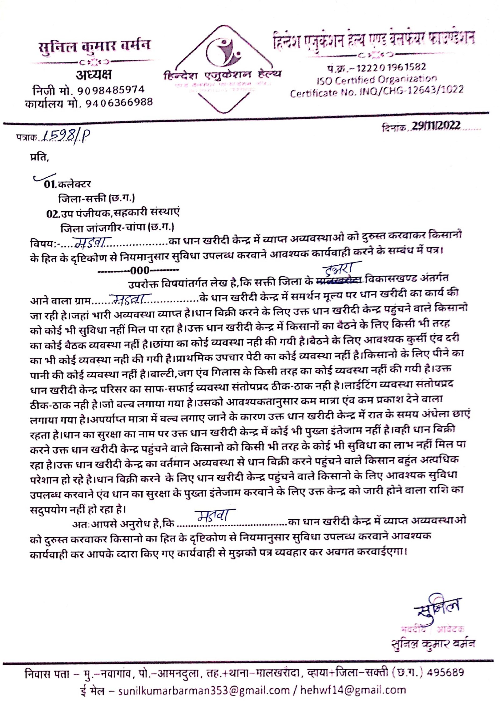 डभरा-सक्ती(एचकेपी 24 न्यूज)।धान खरीदी केन्द्र सुखदा,जवाली,कांसा,बड़े कटेकोनी,कोटमी,रेडा,कंवली,छोटे कटेकोनी,डभरा,चन्द्रपुर,बारापीपर,दर्री,बरतुंगा,पलसदा,कलमा एंव मडवा में मुलभूत सुविधाओ का अभाव होने के कारण धान खरीदी केन्द्र में धान बिक्री करने के लिए पहुंचने वाले किसानों को होने वाले समस्याओ का संज्ञान में आने पर हिन्देश एजुकेशन हेल्थ एण्ड वेलफेयर फाउण्डेशन (रजिस्टर्ड)के अध्यक्ष सुनिल कुमार बर्मन ने कलेक्टर एंव उप पंजीयक सहकारी संस्थाएं को किसानों का हित के दृष्टिकोण से आवश्यक कार्यवाही करने के लिए पत्र लिखा है।