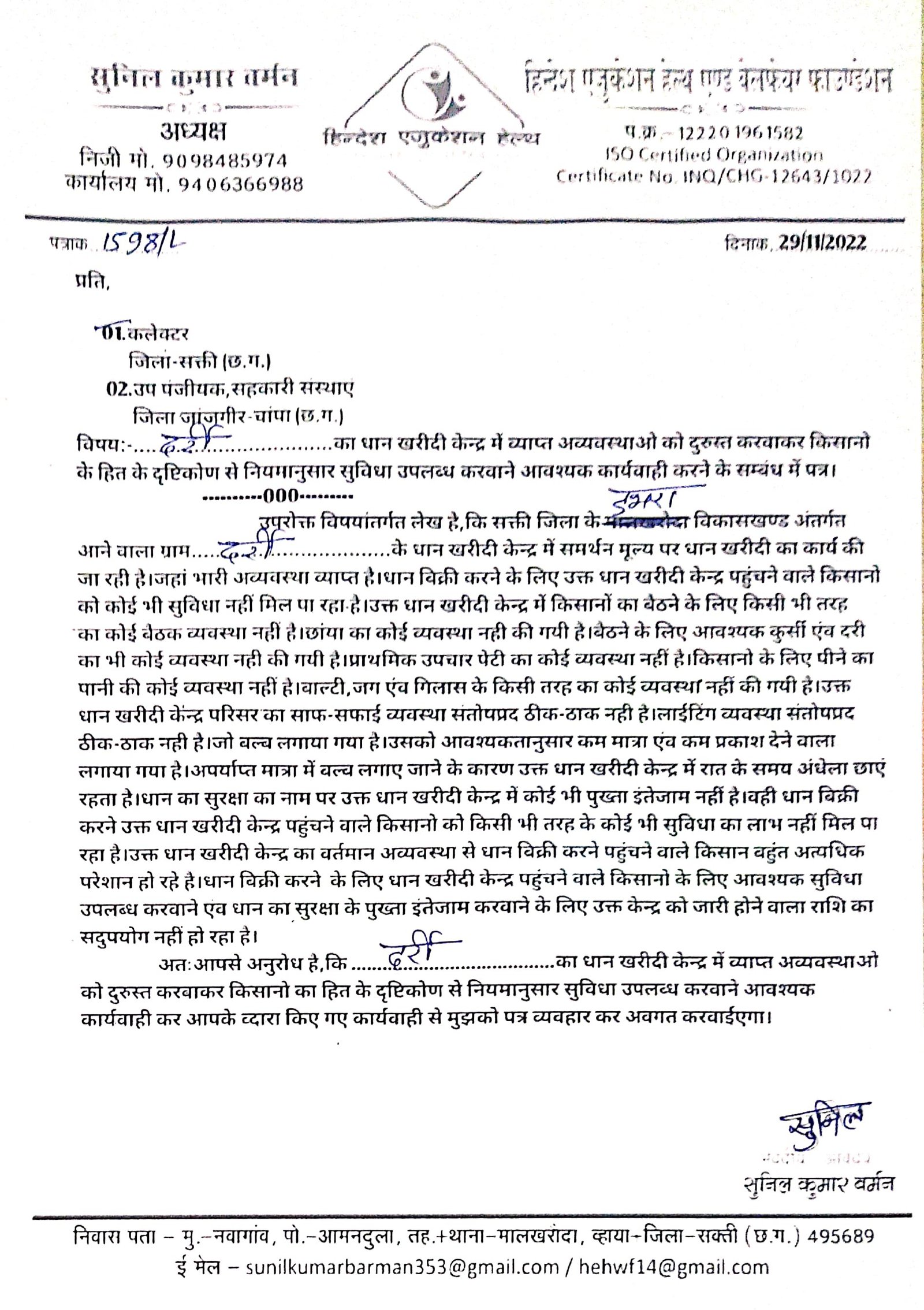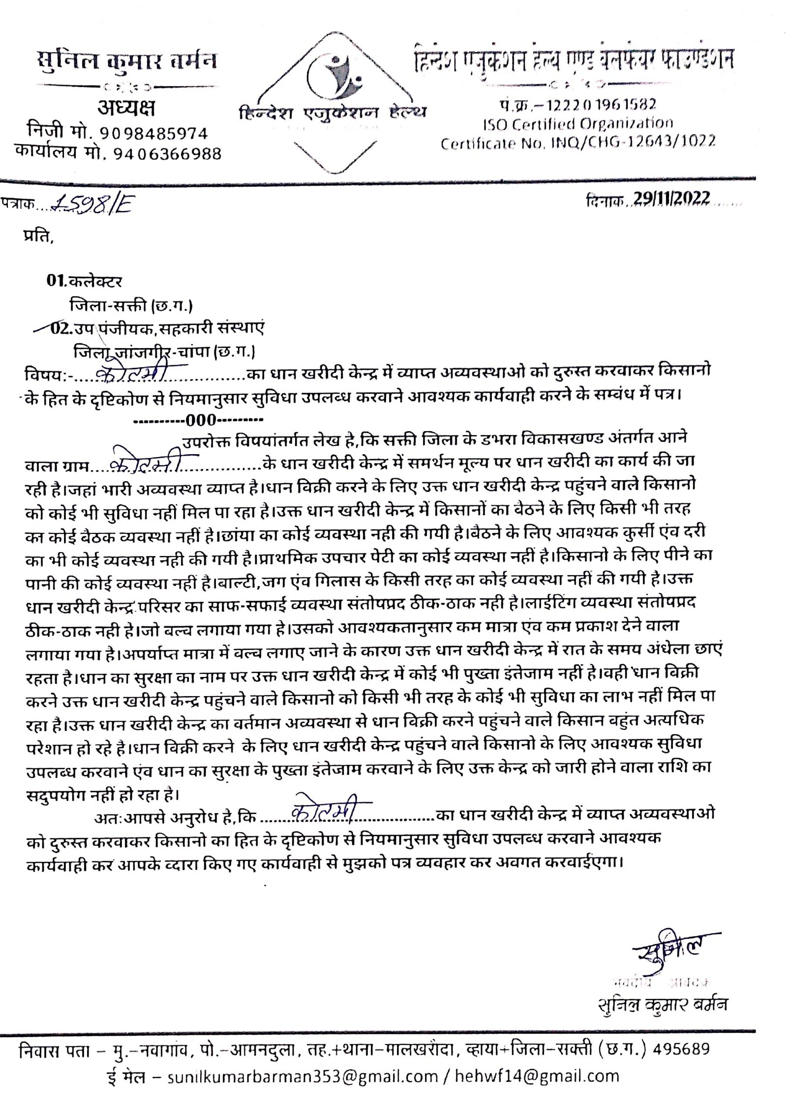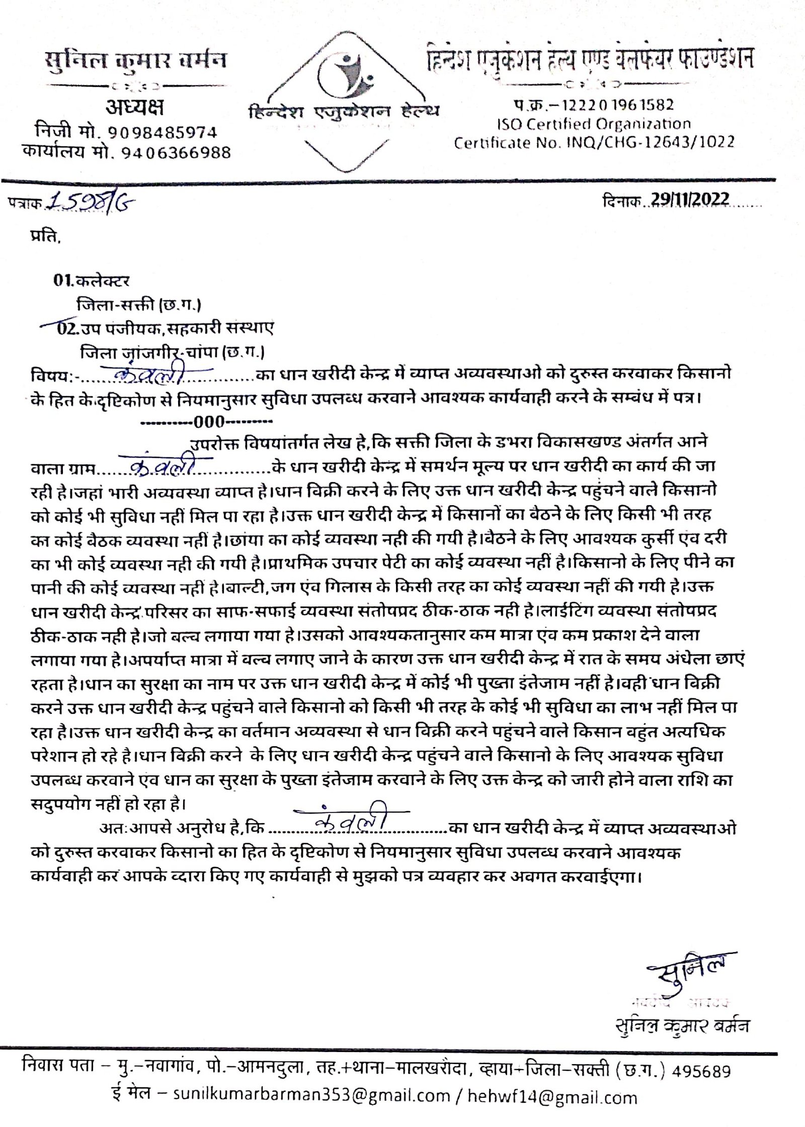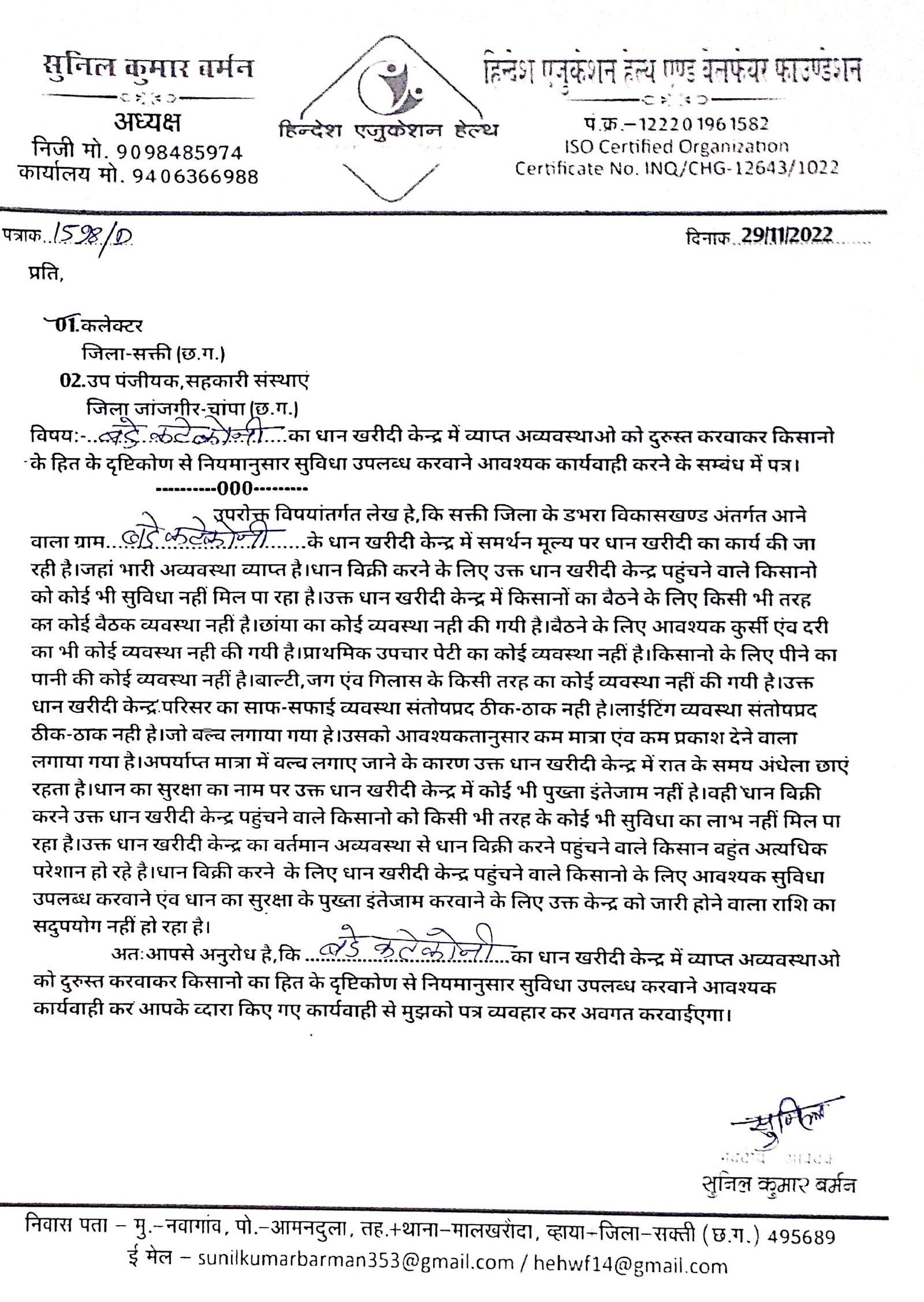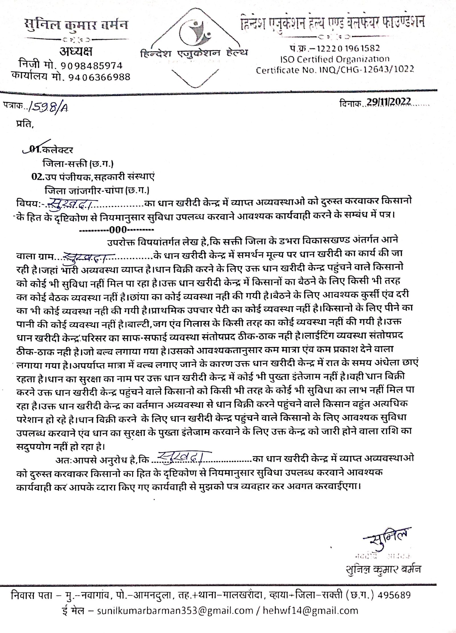 डभरा-सक्ती(एचकेपी 24 न्यूज)।धान खरीदी केन्द्र सुखदा,जवाली,कांसा,बड़े कटेकोनी,कोटमी,रेडा,कंवली,छोटे कटेकोनी,डभरा,चन्द्रपुर,बारापीपर,दर्री,बरतुंगा,पलसदा,कलमा एंव मडवा में मुलभूत सुविधाओ का अभाव होने के कारण धान खरीदी केन्द्र में धान बिक्री करने के लिए पहुंचने वाले किसानों को होने वाले समस्याओ का संज्ञान में आने पर हिन्देश एजुकेशन हेल्थ एण्ड वेलफेयर फाउण्डेशन (रजिस्टर्ड)के अध्यक्ष सुनिल कुमार बर्मन ने कलेक्टर एंव उप पंजीयक सहकारी संस्थाएं को किसानों का हित के दृष्टिकोण से आवश्यक कार्यवाही करने के लिए पत्र लिखा है।