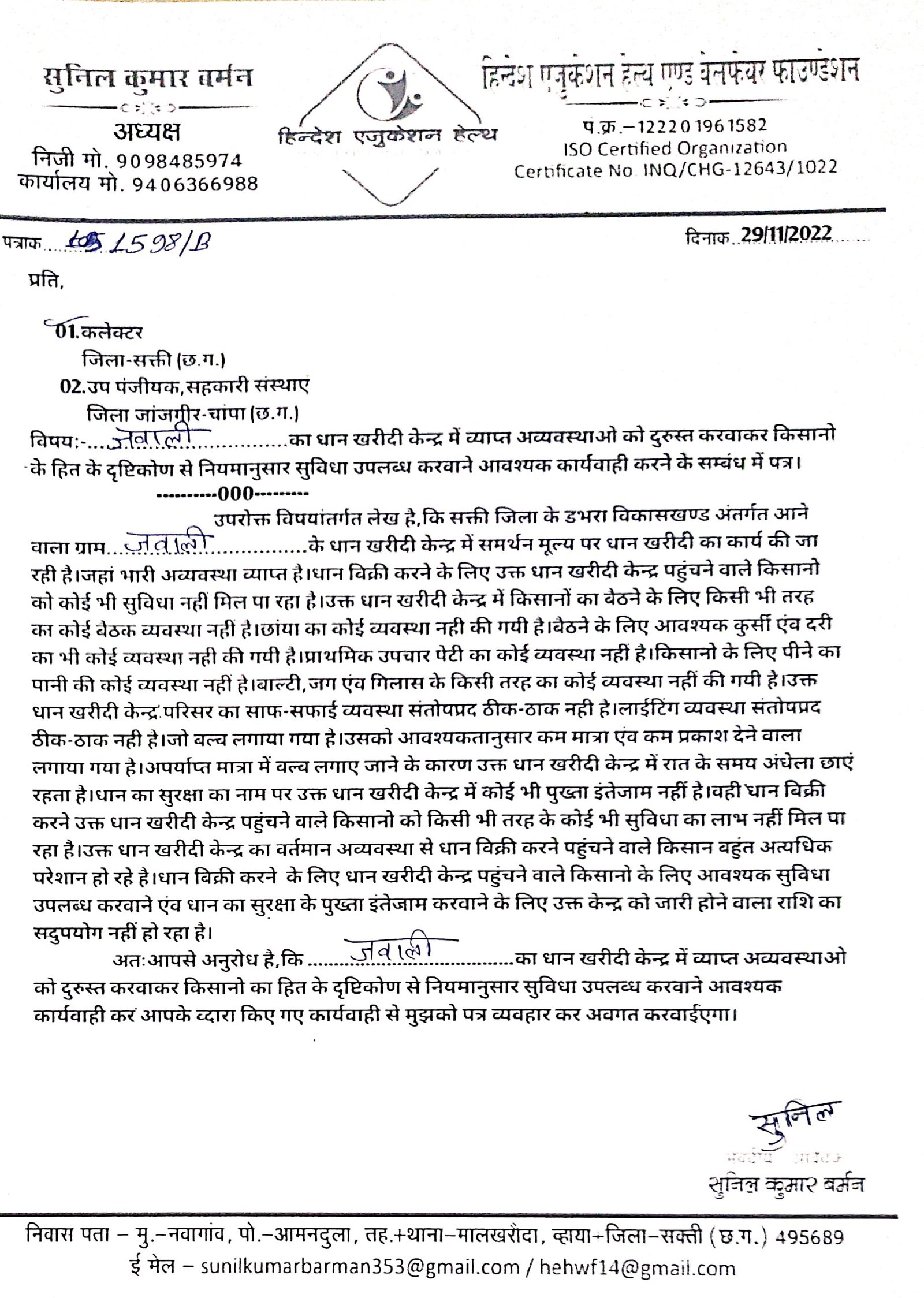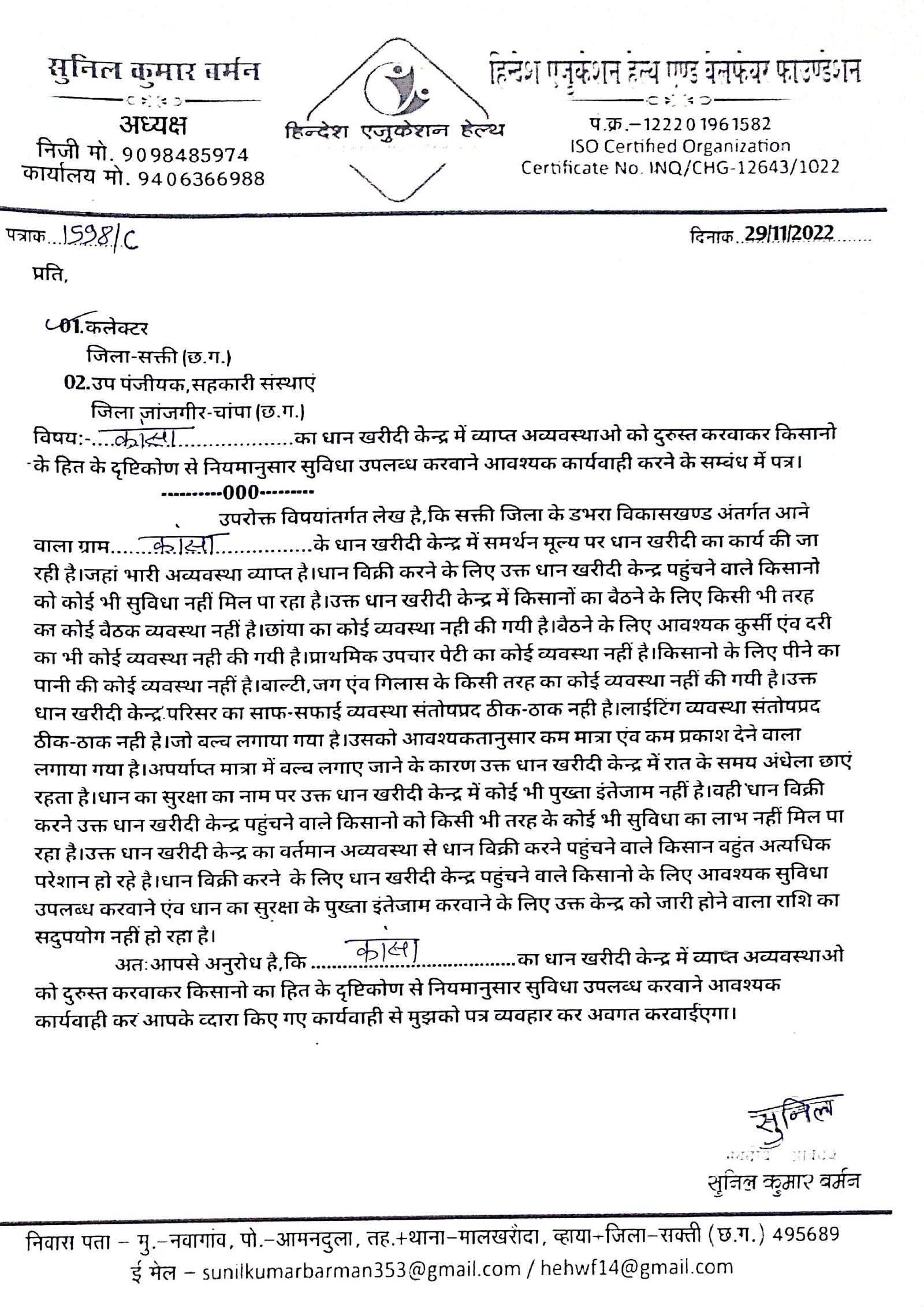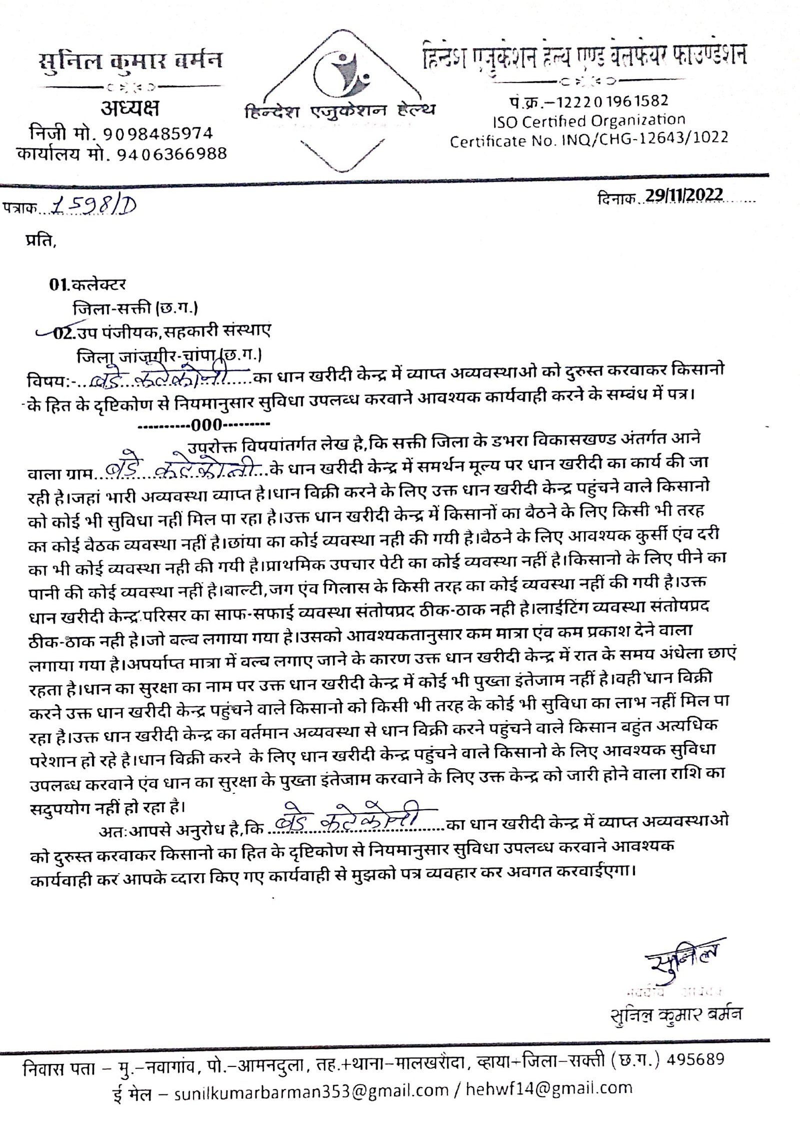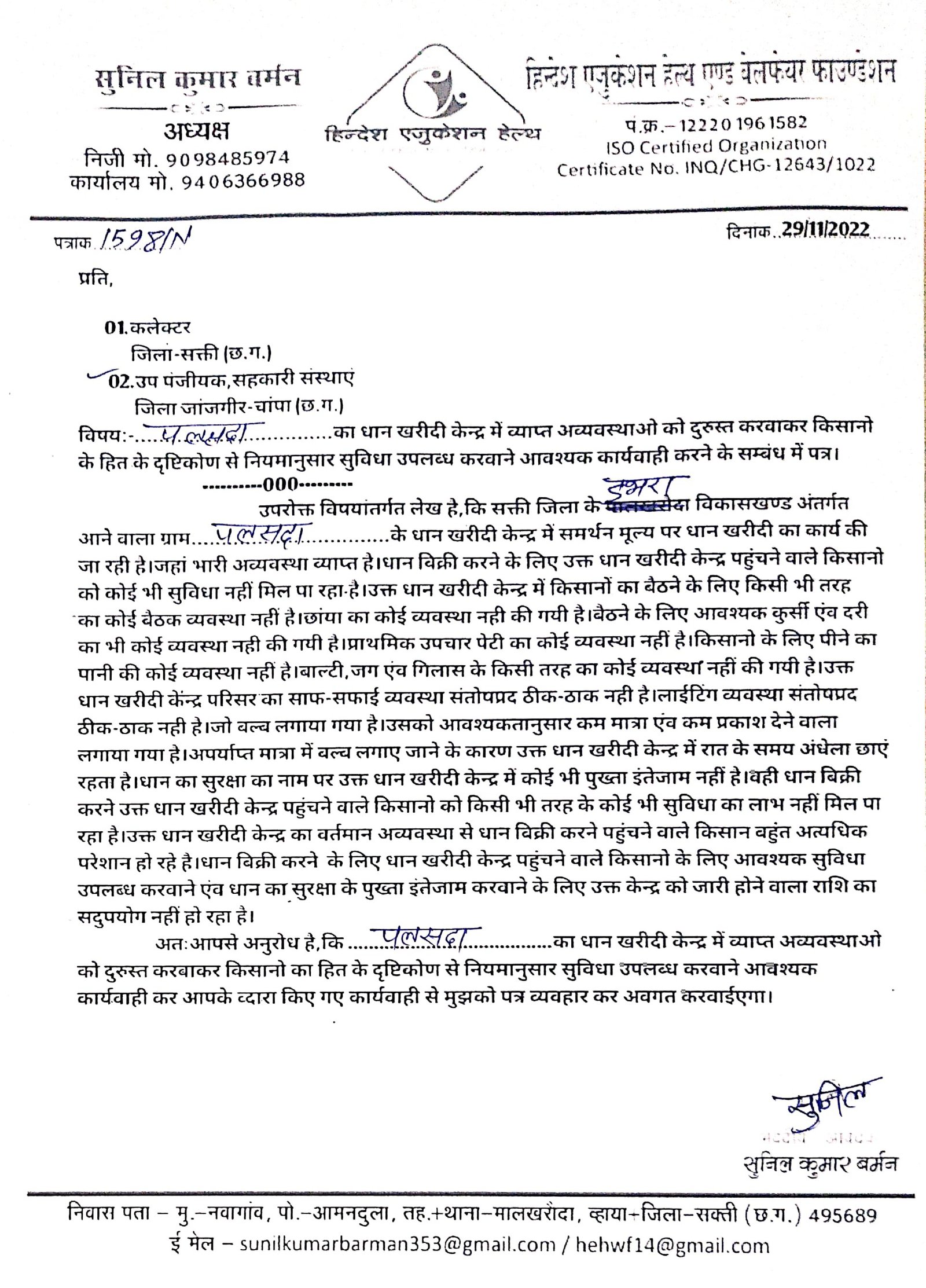 डभरा-सक्ती(एचकेपी 24 न्यूज)।धान खरीदी केन्द्र सुखदा,जवाली,कांसा,बड़े कटेकोनी,कोटमी,रेडा,कंवली,छोटे कटेकोनी,डभरा,चन्द्रपुर,बारापीपर,दर्री,बरतुंगा,पलसदा,कलमा एंव मडवा में मुलभूत सुविधाओ का अभाव होने के कारण धान खरीदी केन्द्र में धान बिक्री करने के लिए पहुंचने वाले किसानों को होने वाले समस्याओ का संज्ञान में आने पर हिन्देश एजुकेशन हेल्थ एण्ड वेलफेयर फाउण्डेशन (रजिस्टर्ड)के अध्यक्ष सुनिल कुमार बर्मन ने कलेक्टर एंव उप पंजीयक सहकारी संस्थाएं को किसानों का हित के दृष्टिकोण से आवश्यक कार्यवाही करने के लिए पत्र लिखा है।