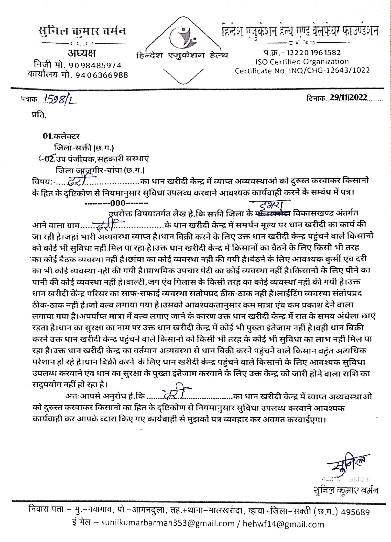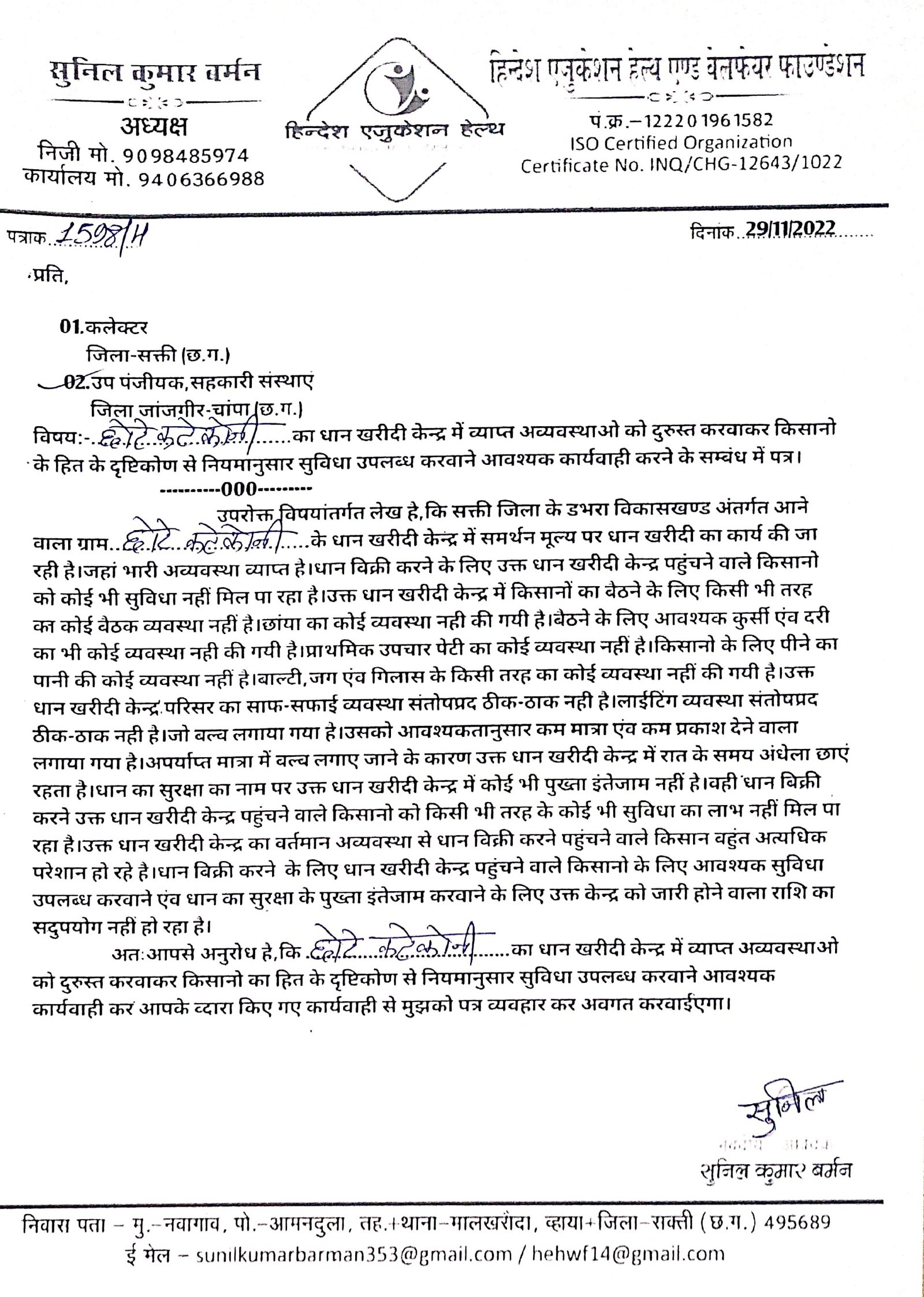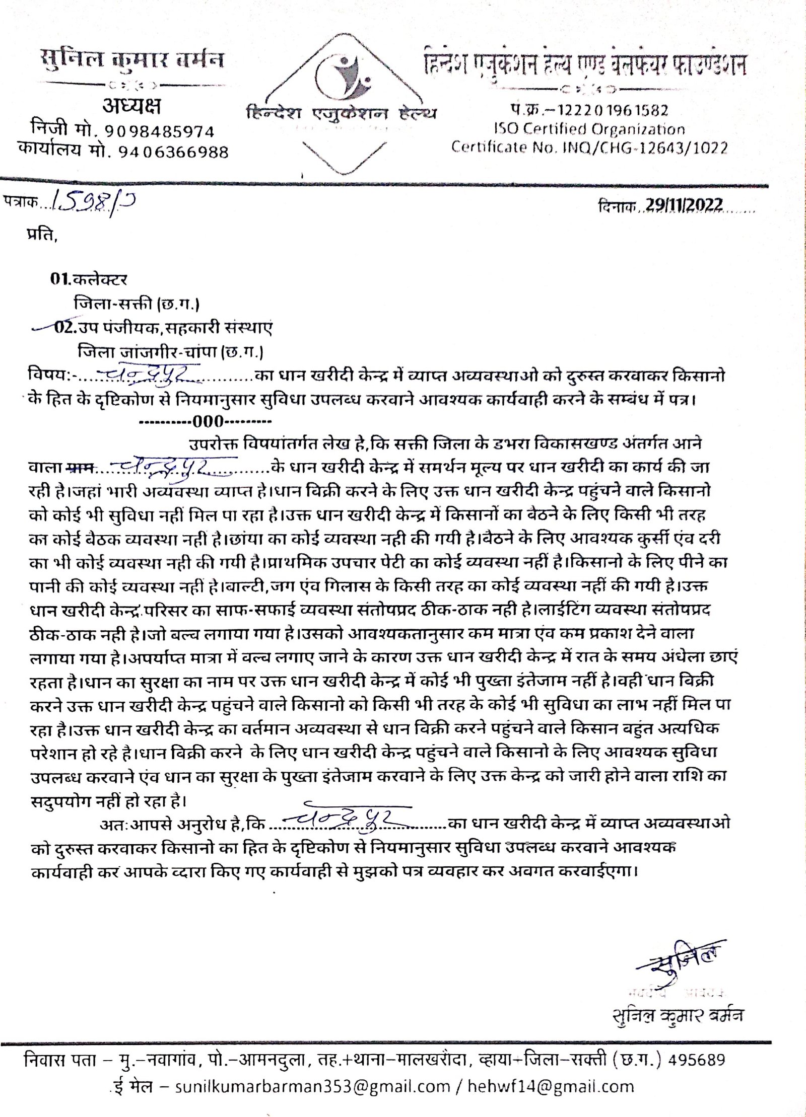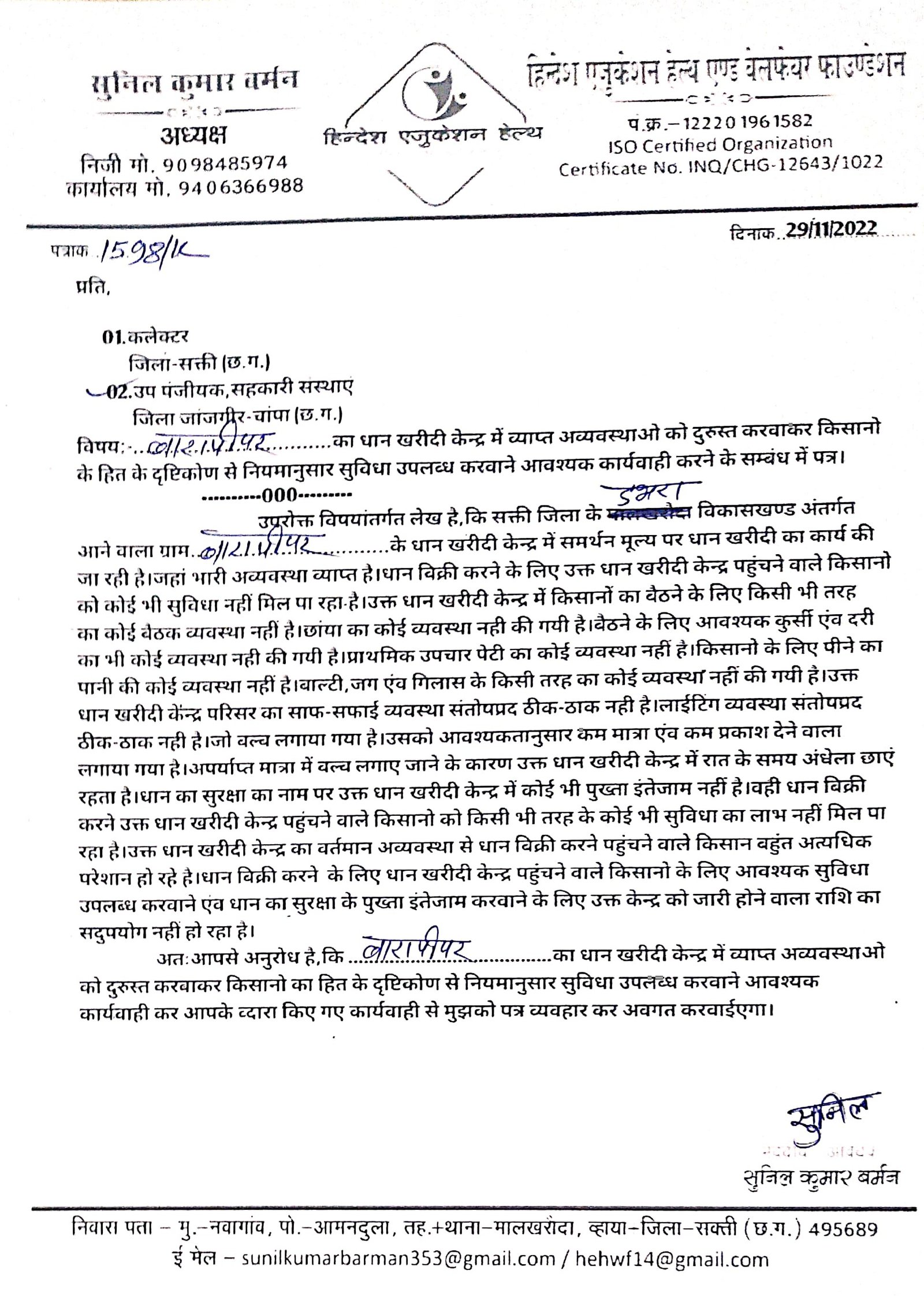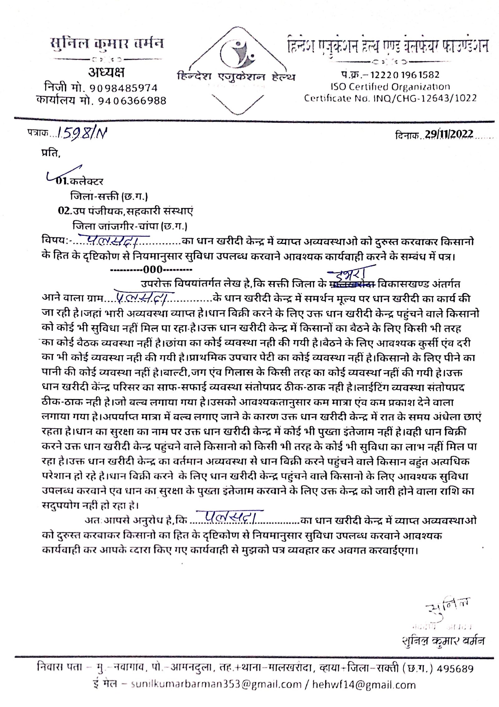 डभरा-सक्ती(एचकेपी 24 न्यूज)।धान खरीदी केन्द्र सुखदा,जवाली,कांसा,बड़े कटेकोनी,कोटमी,रेडा,कंवली,छोटे कटेकोनी,डभरा,चन्द्रपुर,बारापीपर,दर्री,बरतुंगा,पलसदा,कलमा एंव मडवा में मुलभूत सुविधाओ का अभाव होने के कारण धान खरीदी केन्द्र में धान बिक्री करने के लिए पहुंचने वाले किसानों को होने वाले समस्याओ का संज्ञान में आने पर हिन्देश एजुकेशन हेल्थ एण्ड वेलफेयर फाउण्डेशन (रजिस्टर्ड)के अध्यक्ष सुनिल कुमार बर्मन ने कलेक्टर एंव उप पंजीयक सहकारी संस्थाएं को किसानों का हित के दृष्टिकोण से आवश्यक कार्यवाही करने के लिए पत्र लिखा है।
