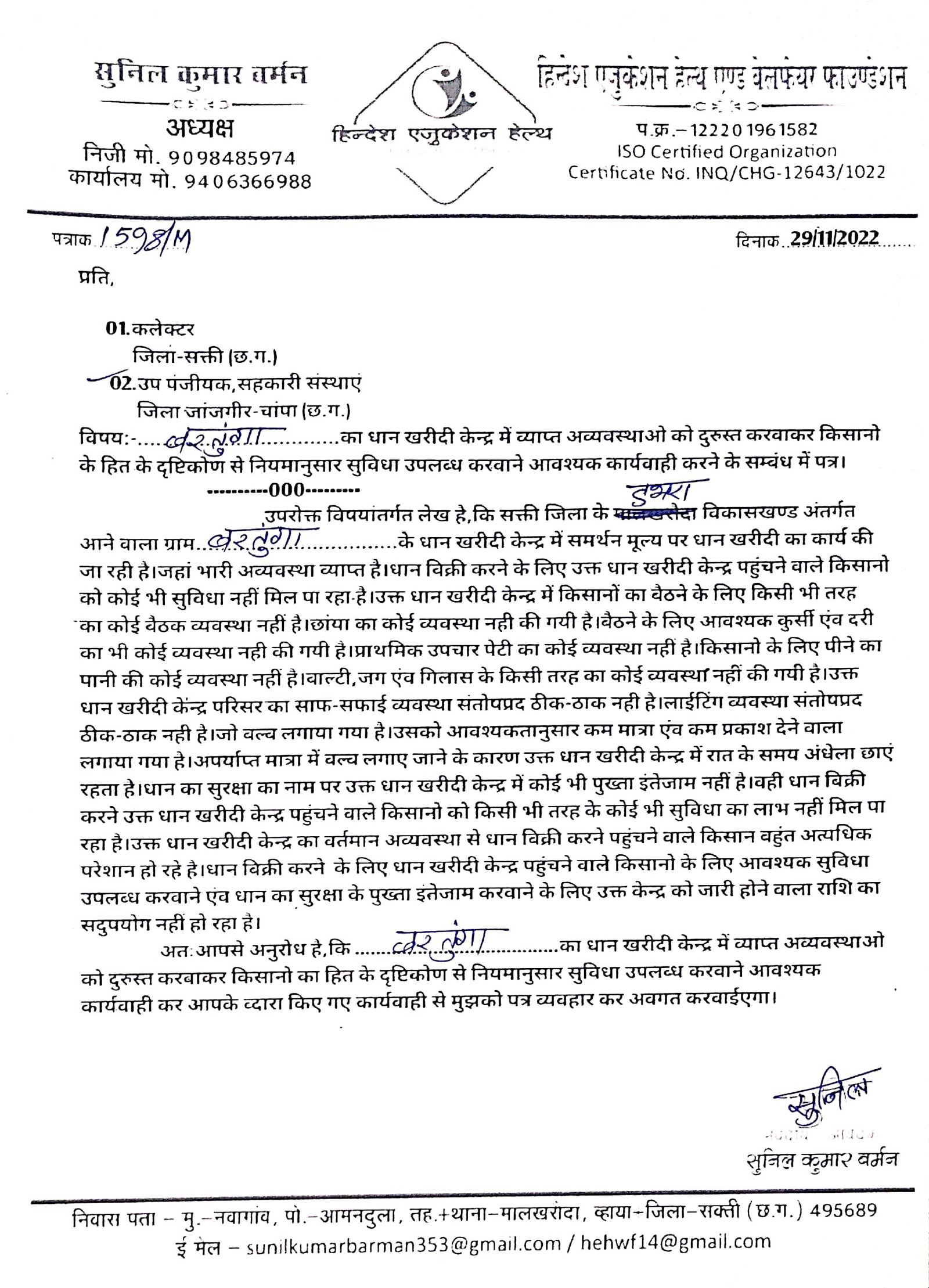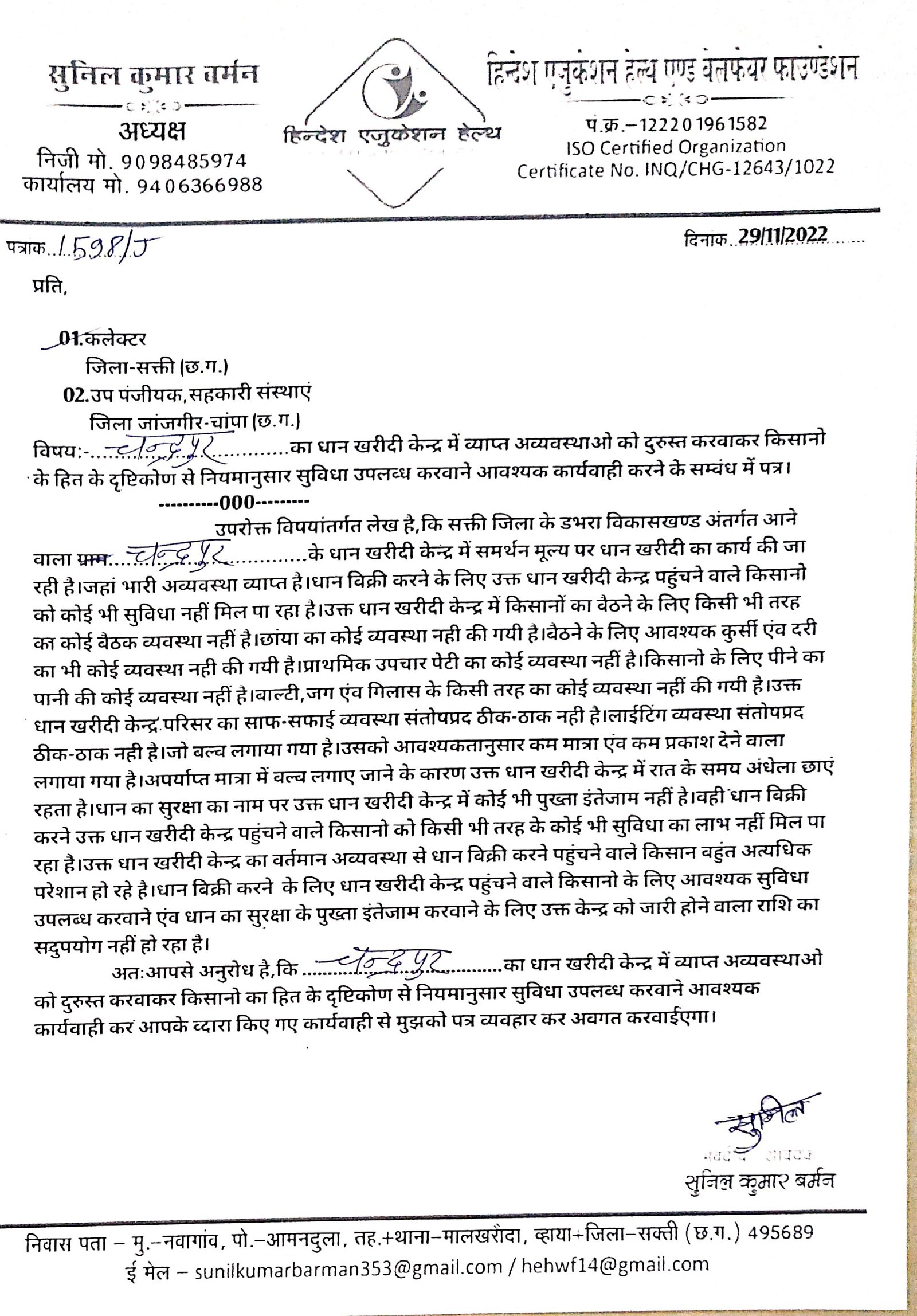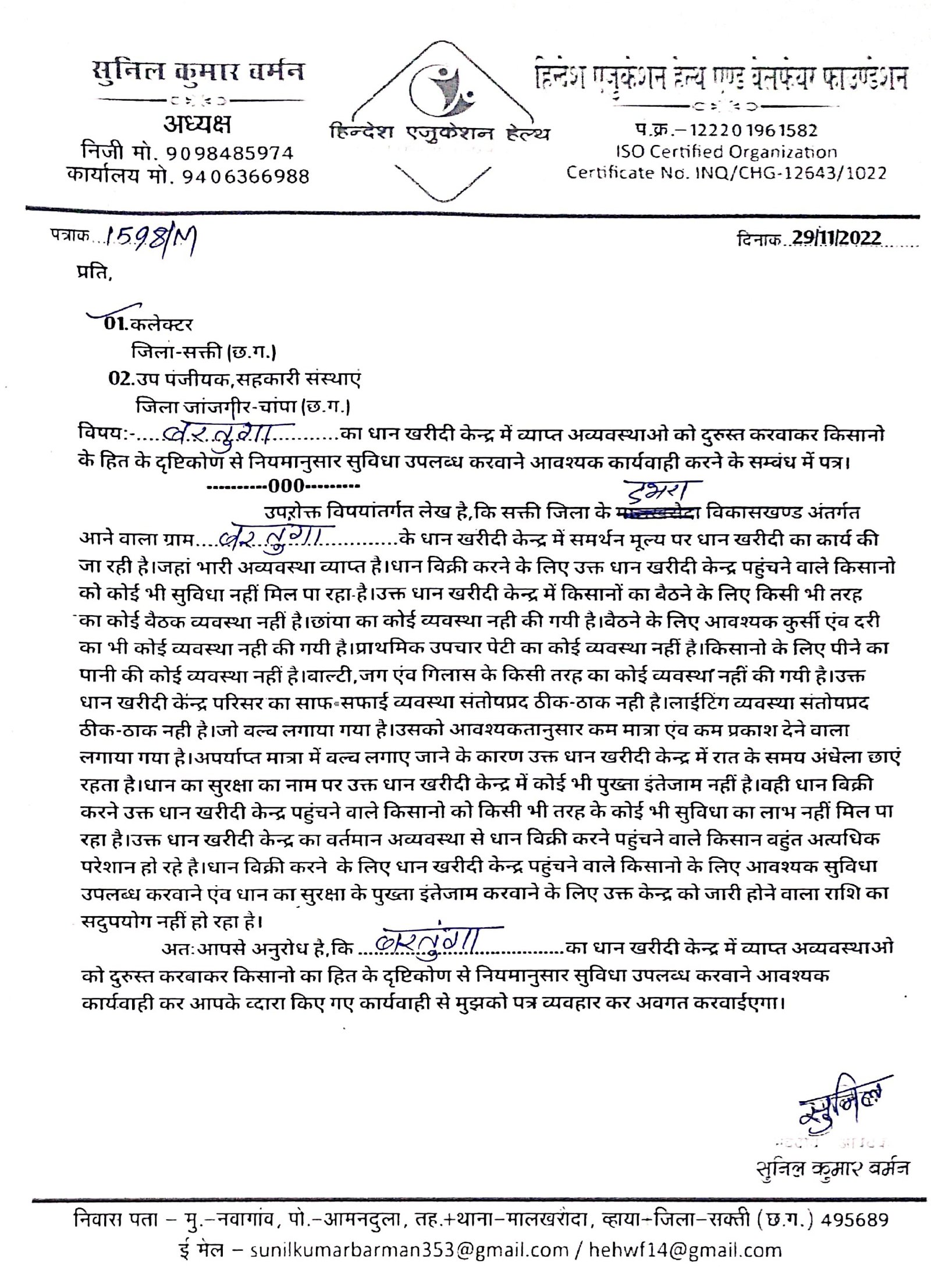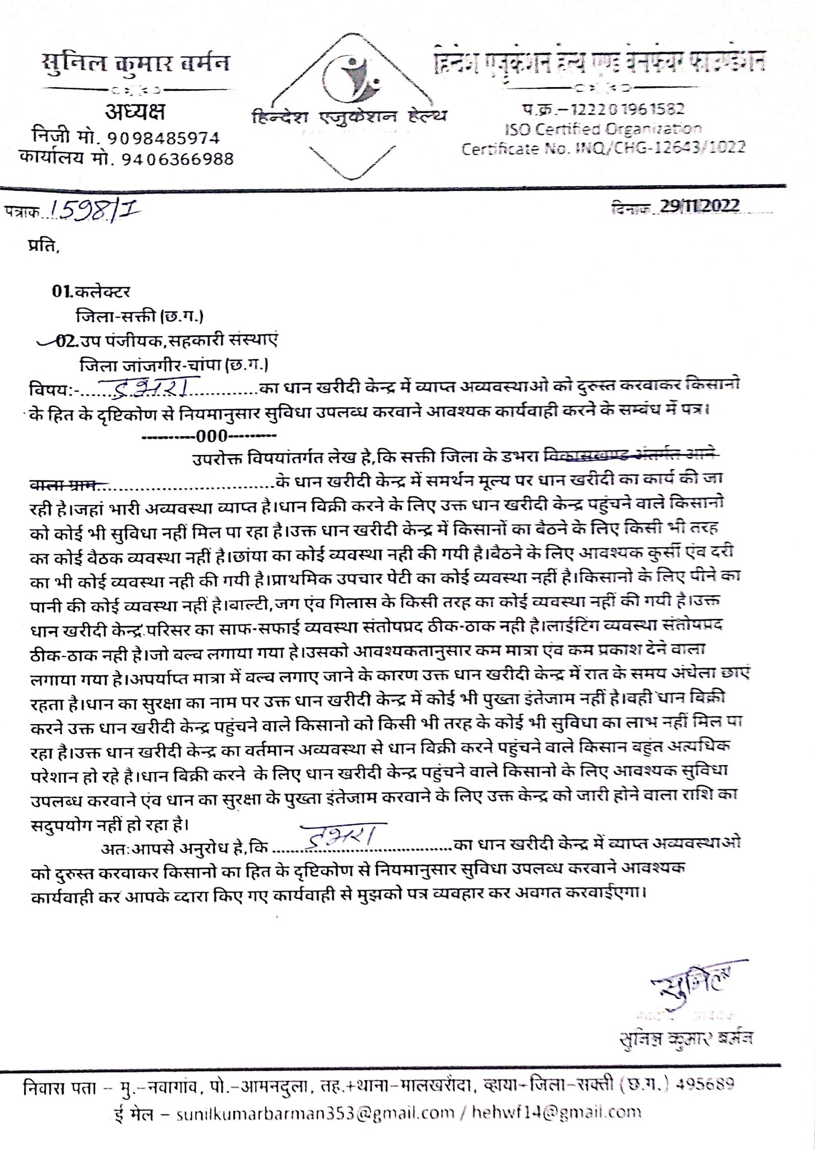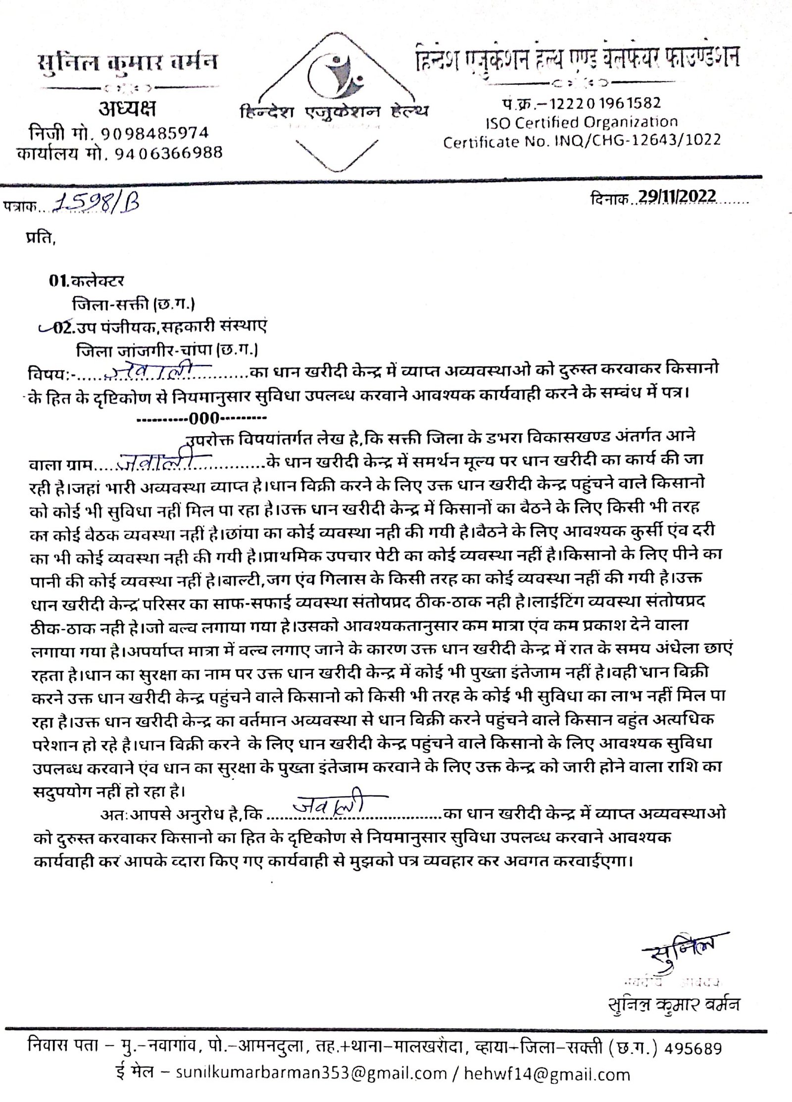 डभरा-सक्ती(एचकेपी 24 न्यूज)।धान खरीदी केन्द्र सुखदा,जवाली,कांसा,बड़े कटेकोनी,कोटमी,रेडा,कंवली,छोटे कटेकोनी,डभरा,चन्द्रपुर,बारापीपर,दर्री,बरतुंगा,पलसदा,कलमा एंव मडवा में मुलभूत सुविधाओ का अभाव होने के कारण धान खरीदी केन्द्र में धान बिक्री करने के लिए पहुंचने वाले किसानों को होने वाले समस्याओ का संज्ञान में आने पर हिन्देश एजुकेशन हेल्थ एण्ड वेलफेयर फाउण्डेशन (रजिस्टर्ड)के अध्यक्ष सुनिल कुमार बर्मन ने कलेक्टर एंव उप पंजीयक सहकारी संस्थाएं को किसानों का हित के दृष्टिकोण से आवश्यक कार्यवाही करने के लिए पत्र लिखा है।