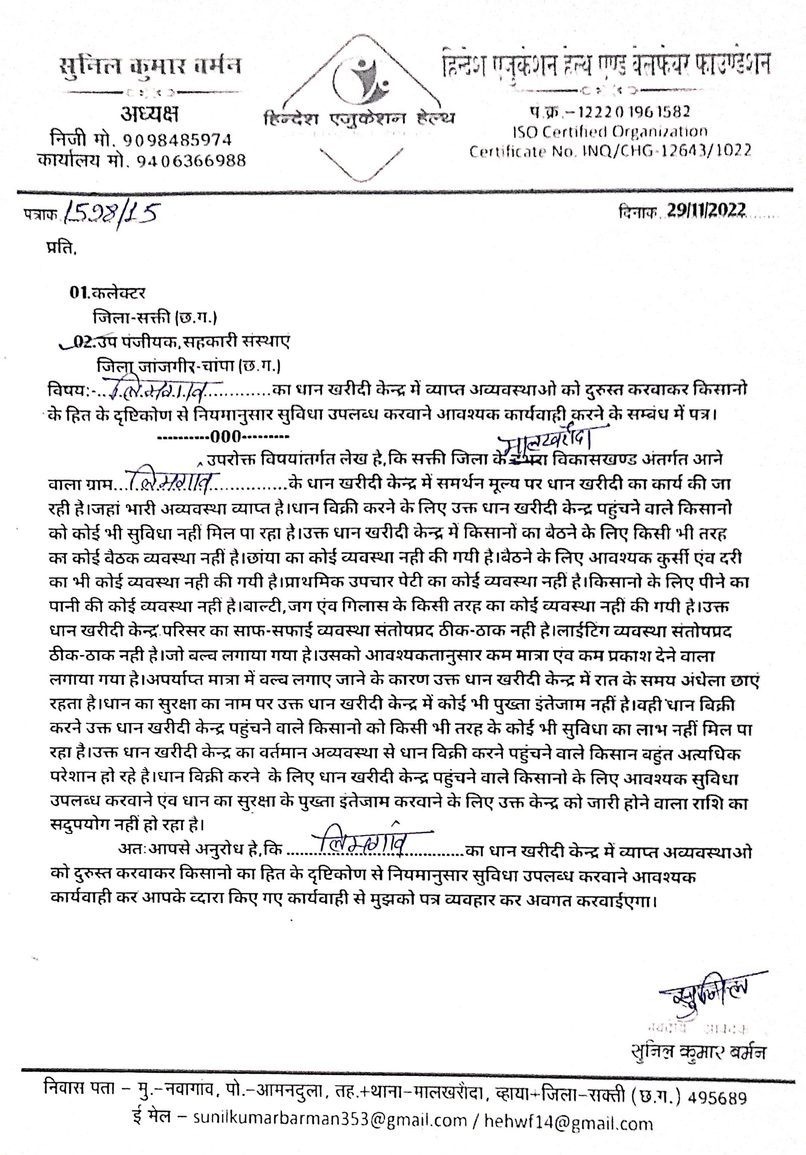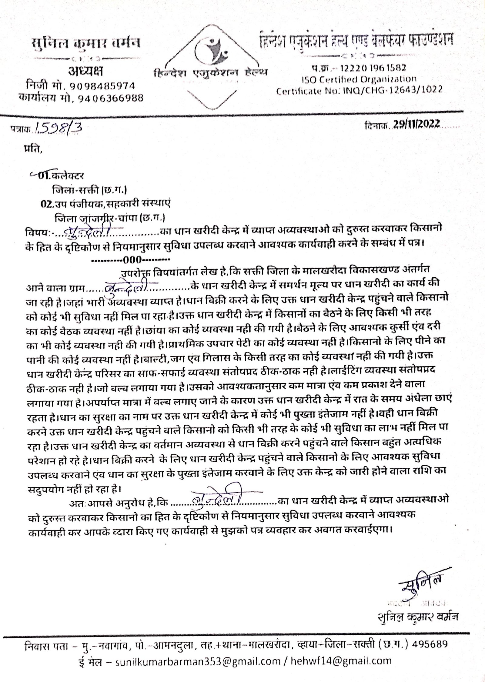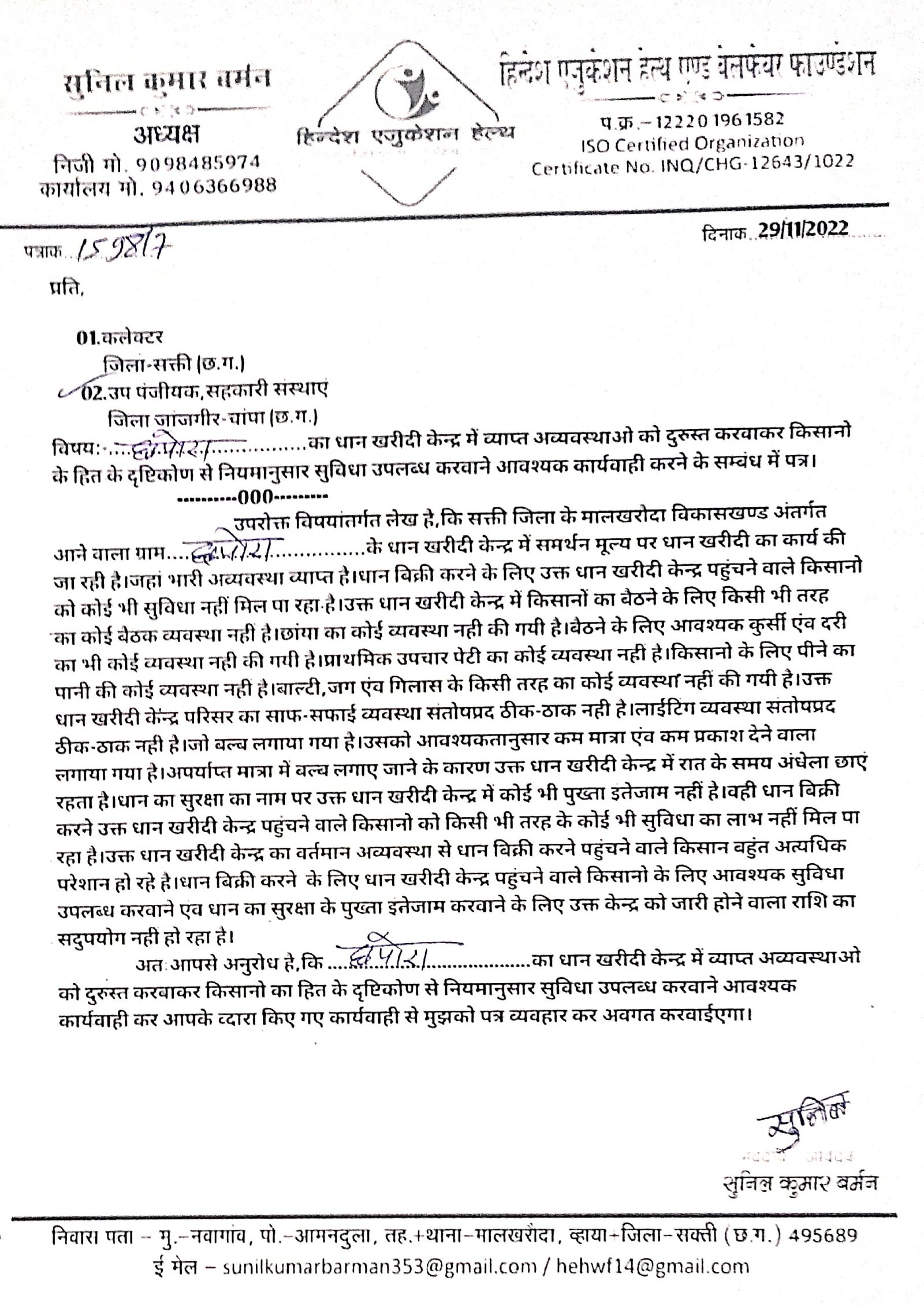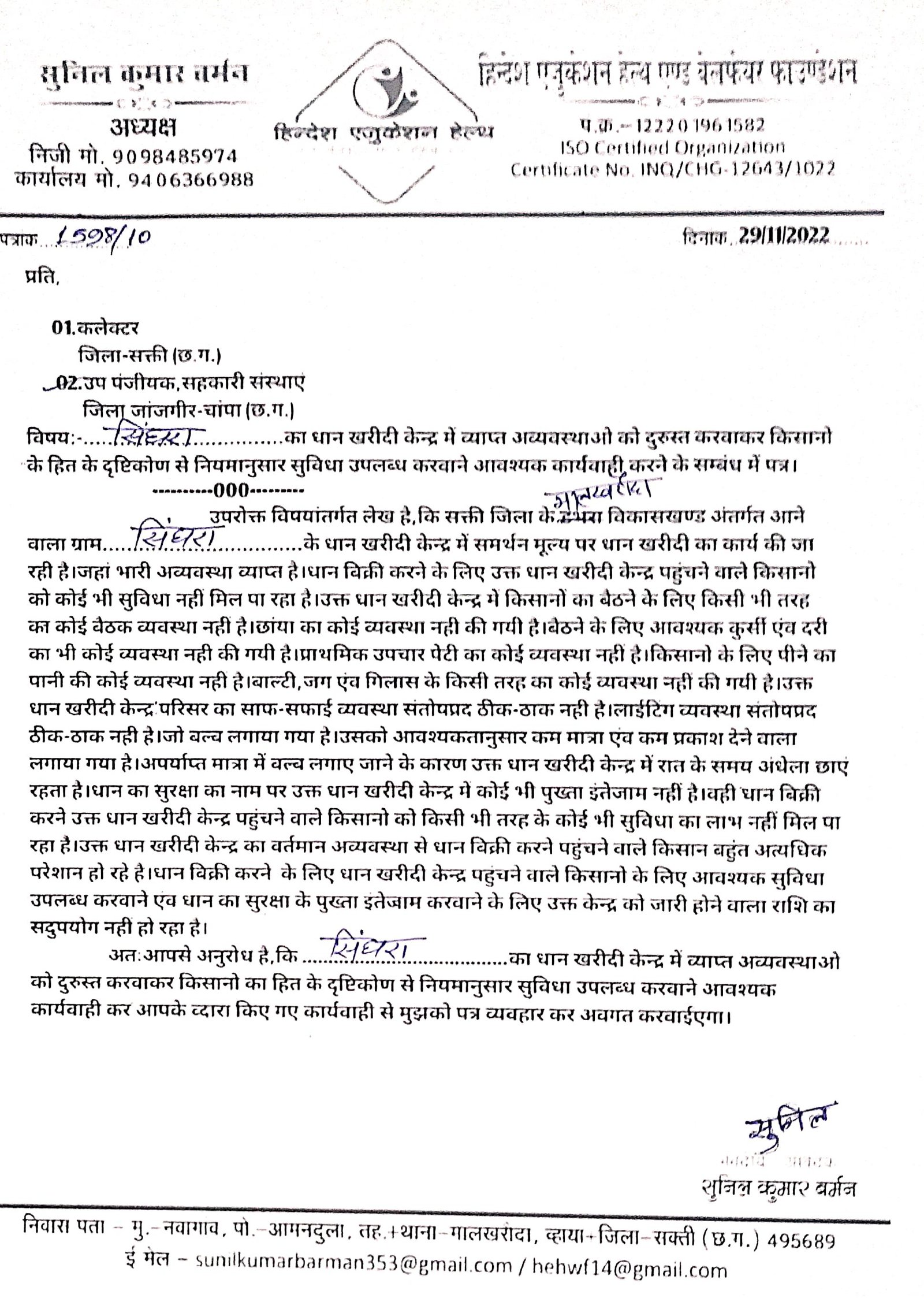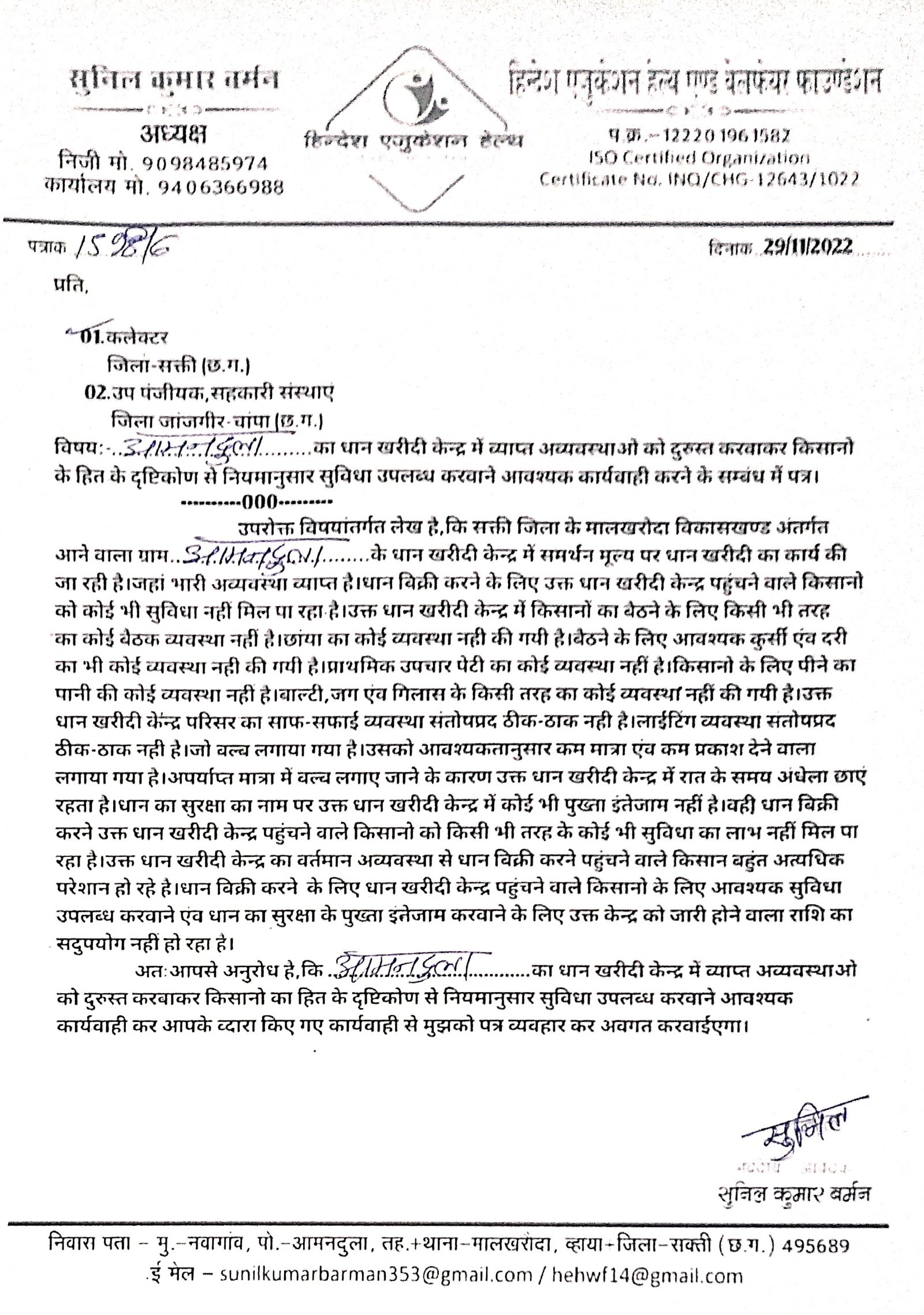 मालखरौदा-सक्ती(एचकेपी 24 न्यूज)।धान खरीदी केन्द्र मोहंदीकला,अडभार,सिंघरा,बुन्देली,पिरदा,घोघरी,आमनदुला,छपोरा,मुक्ता,मालखरौदा,बड़े पाडरमुडा,सुलौनी,करिगांव,पोता,लिमगांव,भांटा,कर्रापाली एंव जमगहन में मुलभूत सुविधाओ का अभाव होने के कारण धान खरीदी केन्द्र में धान बिक्री करने के लिए पहुंचने वाले किसानों को होने वाले समस्याओ का संज्ञान में आने पर हिन्देश एजुकेशन हेल्थ एण्ड वेलफेयर फाउण्डेशन (रजिस्टर्ड)के अध्यक्ष सुनिल कुमार बर्मन ने कलेक्टर एंव उप पंजीयक सहकारी संस्थाएं को किसानों का हित के दृष्टिकोण से आवश्यक कार्यवाही करने के लिए पत्र लिखा है।