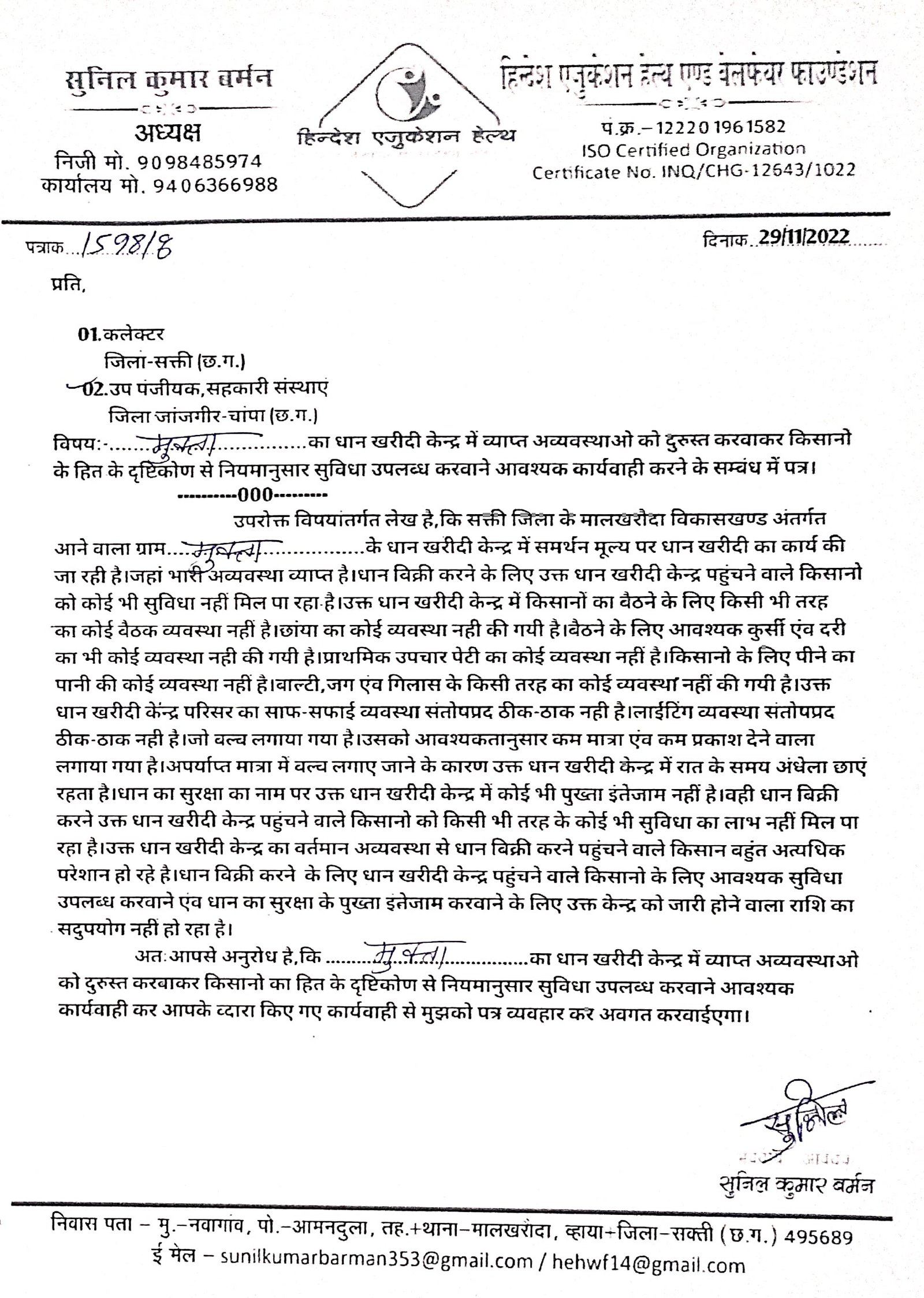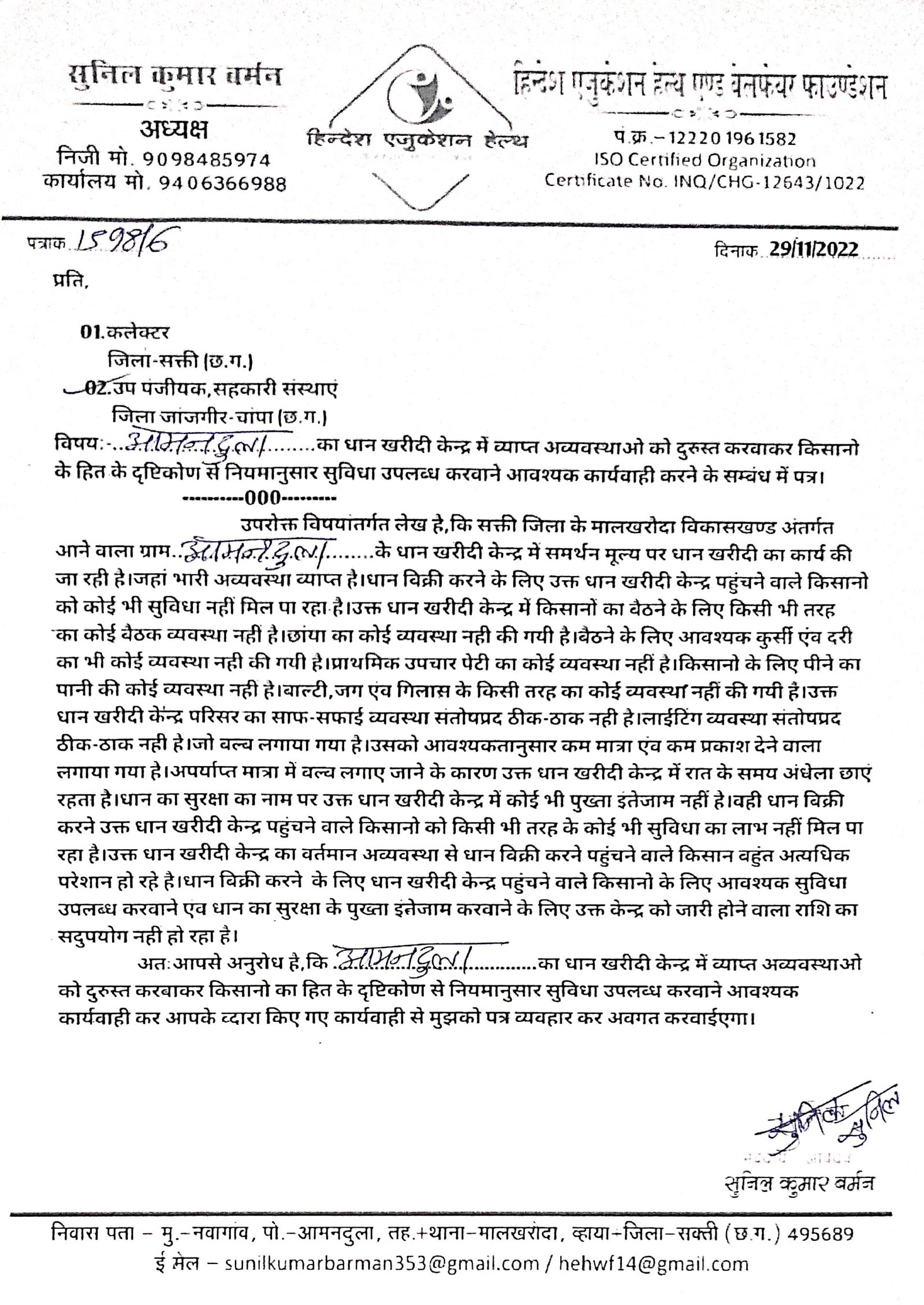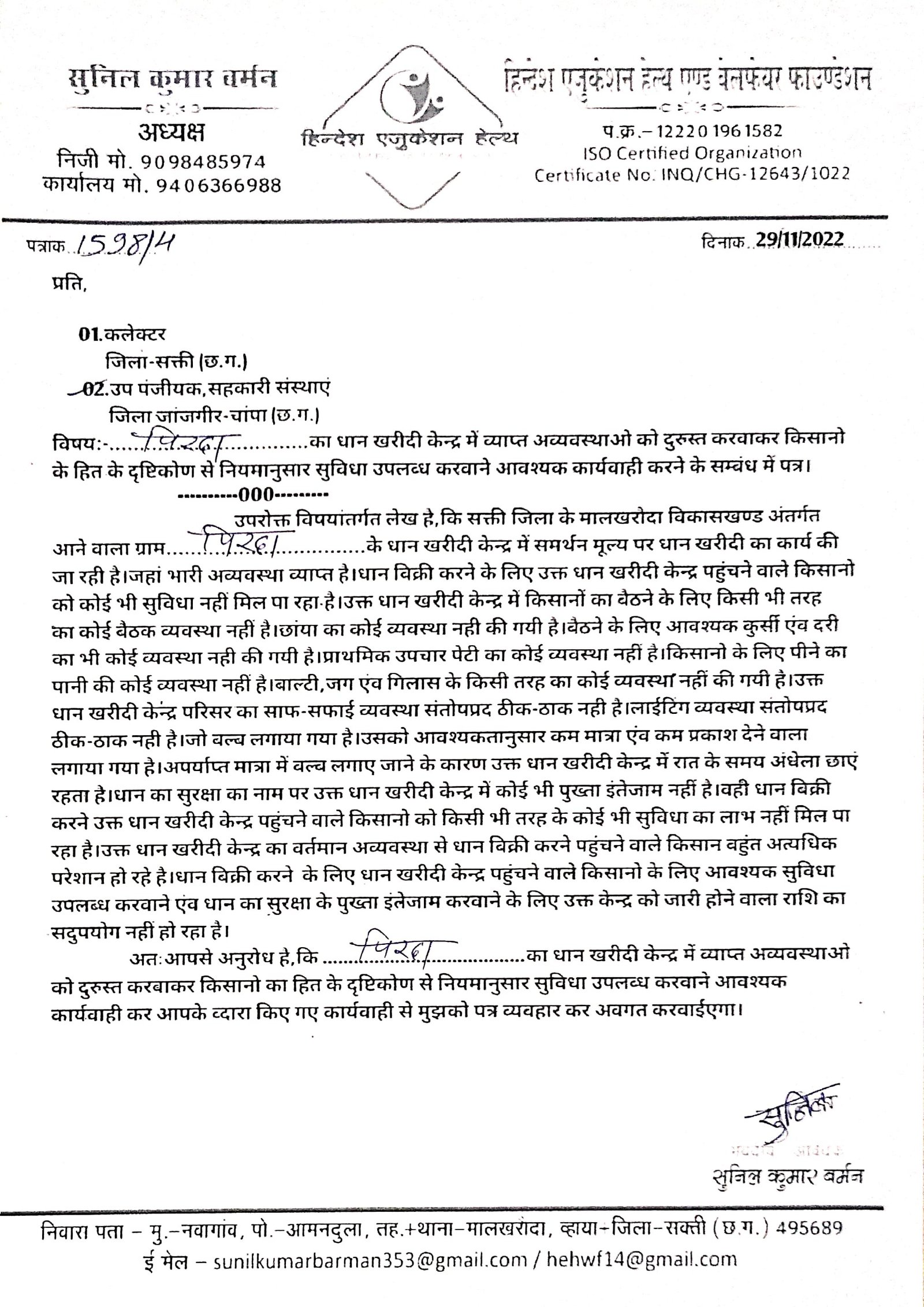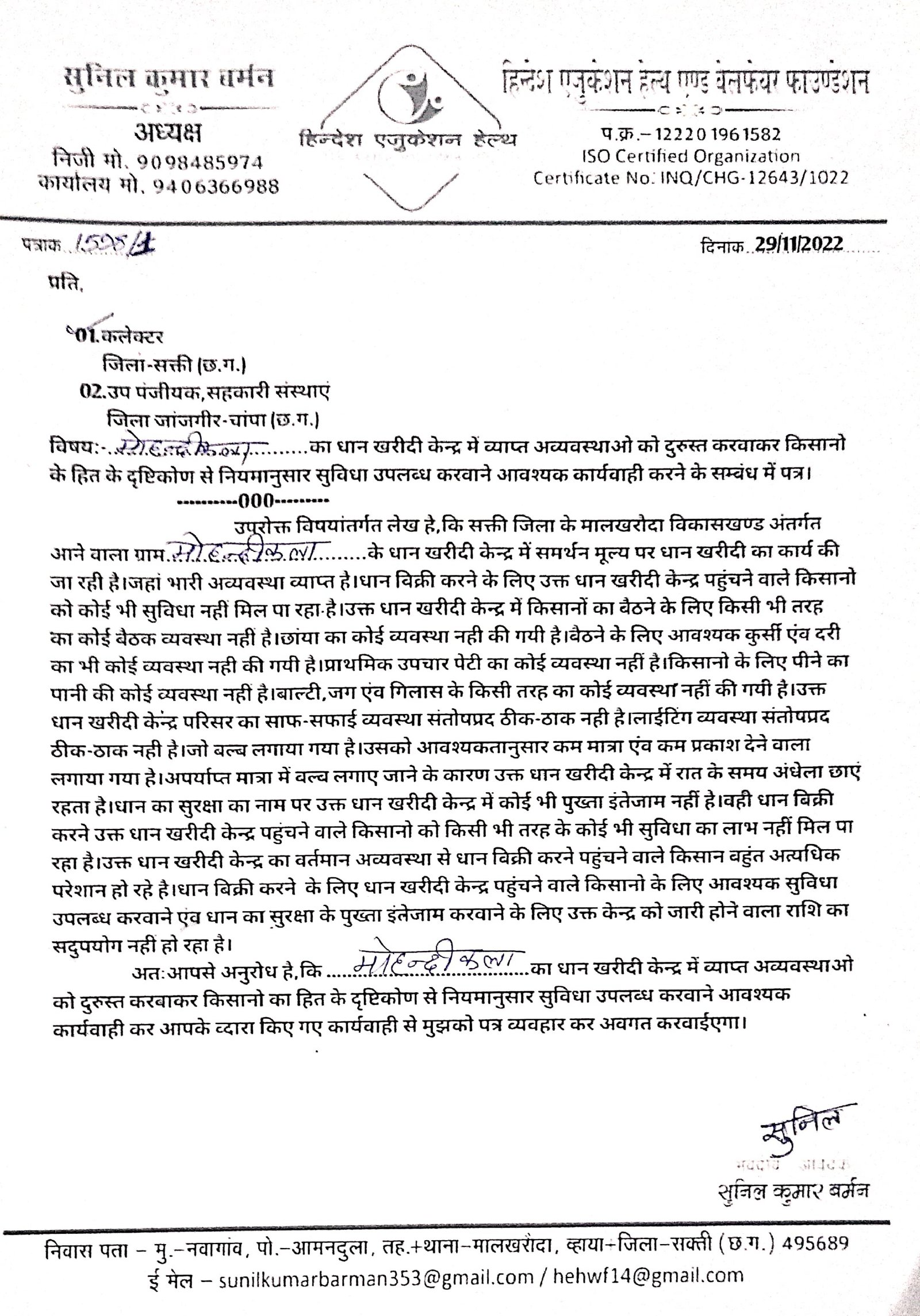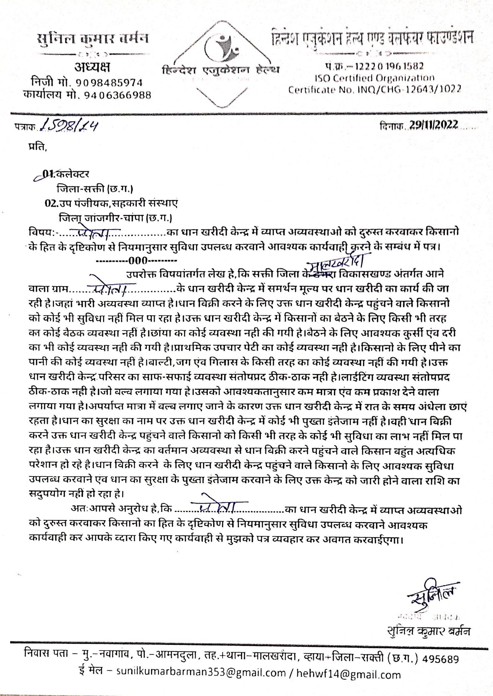 मालखरौदा-सक्ती(एचकेपी 24 न्यूज)।धान खरीदी केन्द्र मोहंदीकला,अडभार,सिंघरा,बुन्देली,पिरदा,घोघरी,आमनदुला,छपोरा,मुक्ता,मालखरौदा,बड़े पाडरमुडा,सुलौनी,करिगांव,पोता,लिमगांव,भांटा,कर्रापाली एंव जमगहन में मुलभूत सुविधाओ का अभाव होने के कारण धान खरीदी केन्द्र में धान बिक्री करने के लिए पहुंचने वाले किसानों को होने वाले समस्याओ का संज्ञान में आने पर हिन्देश एजुकेशन हेल्थ एण्ड वेलफेयर फाउण्डेशन (रजिस्टर्ड)के अध्यक्ष सुनिल कुमार बर्मन ने कलेक्टर एंव उप पंजीयक सहकारी संस्थाएं को किसानों का हित के दृष्टिकोण से आवश्यक कार्यवाही करने के लिए पत्र लिखा है।