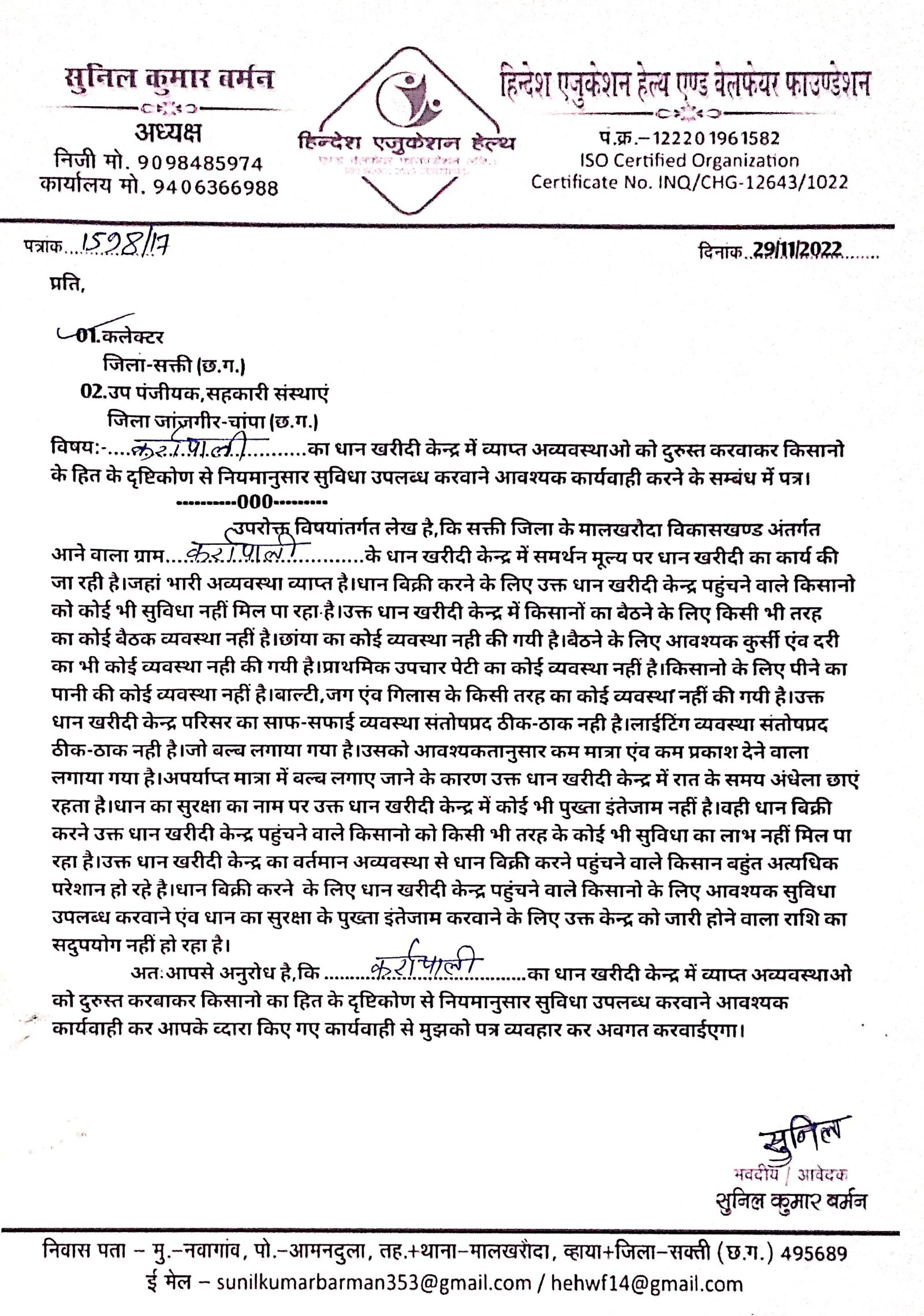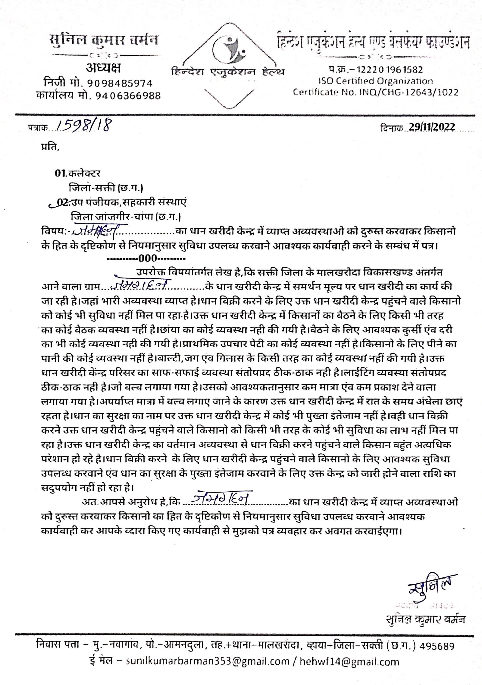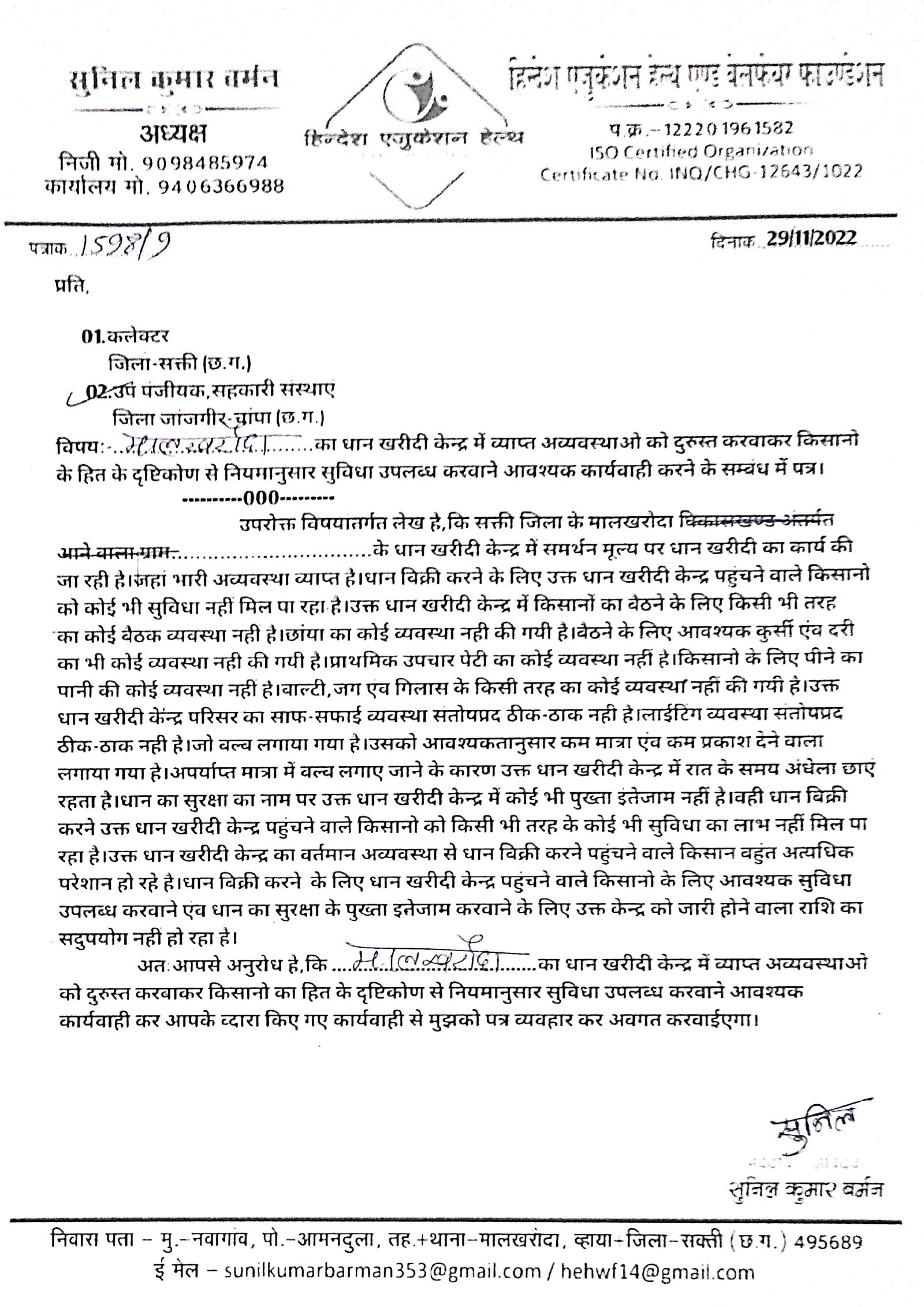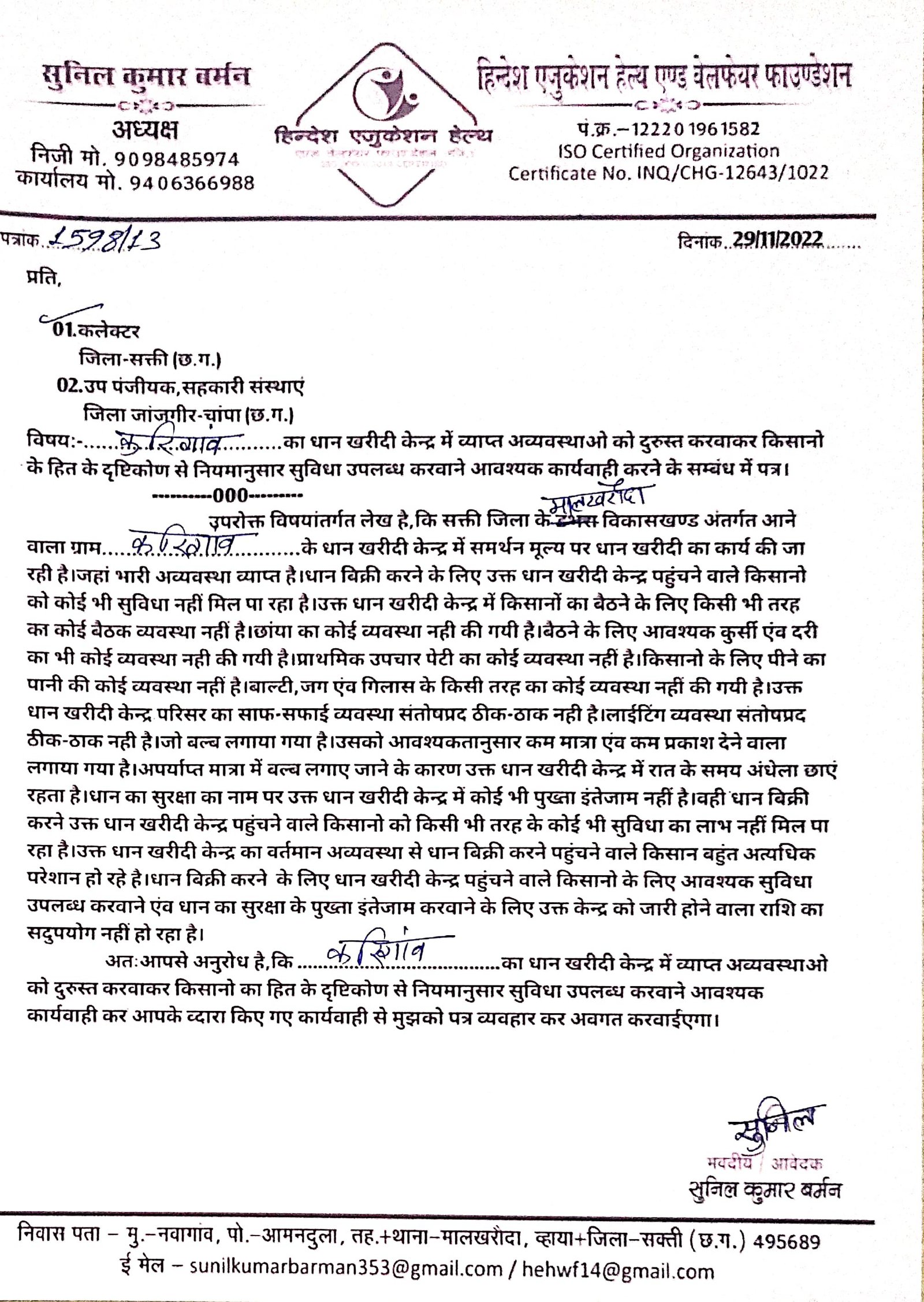मालखरौदा-सक्ती(एचकेपी 24 न्यूज)।धान खरीदी केन्द्र मोहंदीकला,अडभार,सिंघरा,बुन्देली,पिरदा,घोघरी,आमनदुला,छपोरा,मुक्ता,मालखरौदा,बड़े पाडरमुडा,सुलौनी,करिगांव,पोता,लिमगांव,भांटा,कर्रापाली एंव जमगहन में मुलभूत सुविधाओ का अभाव होने के कारण धान खरीदी केन्द्र में धान बिक्री करने के लिए पहुंचने वाले किसानों को होने वाले समस्याओ का संज्ञान में आने पर हिन्देश एजुकेशन हेल्थ एण्ड वेलफेयर फाउण्डेशन (रजिस्टर्ड)के अध्यक्ष सुनिल कुमार बर्मन ने कलेक्टर एंव उप पंजीयक सहकारी संस्थाएं को किसानों का हित के दृष्टिकोण से आवश्यक कार्यवाही करने के लिए पत्र लिखा है।