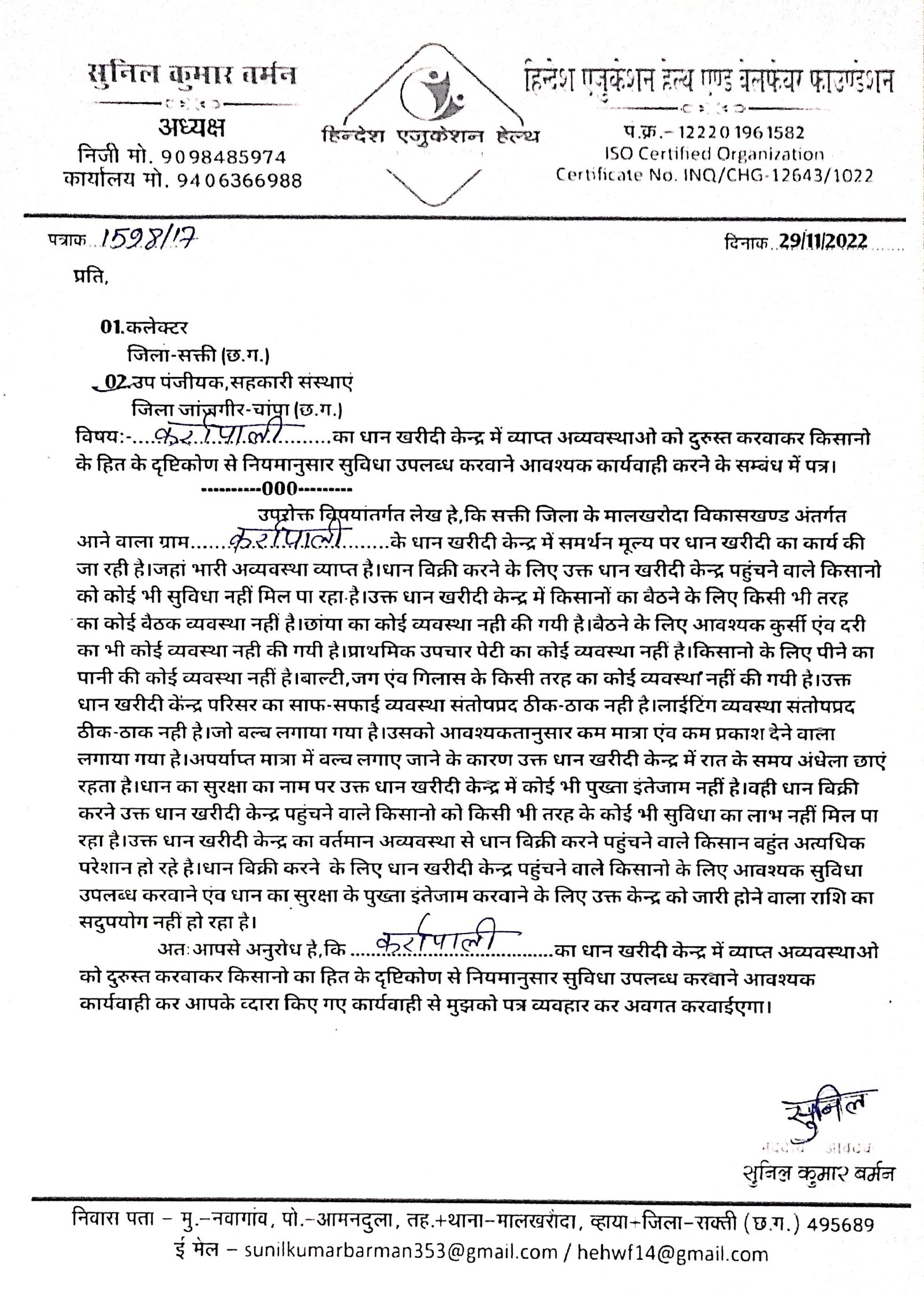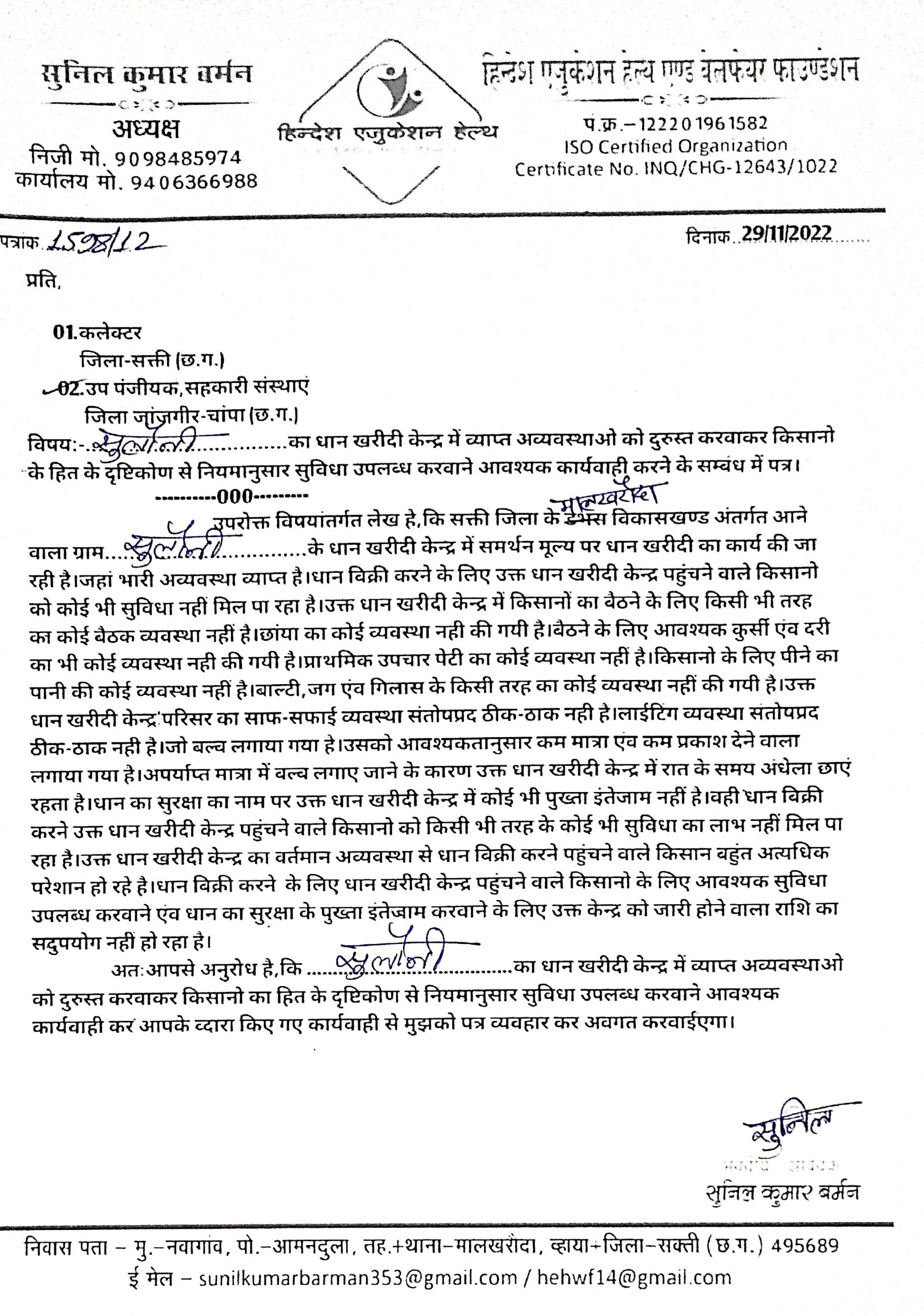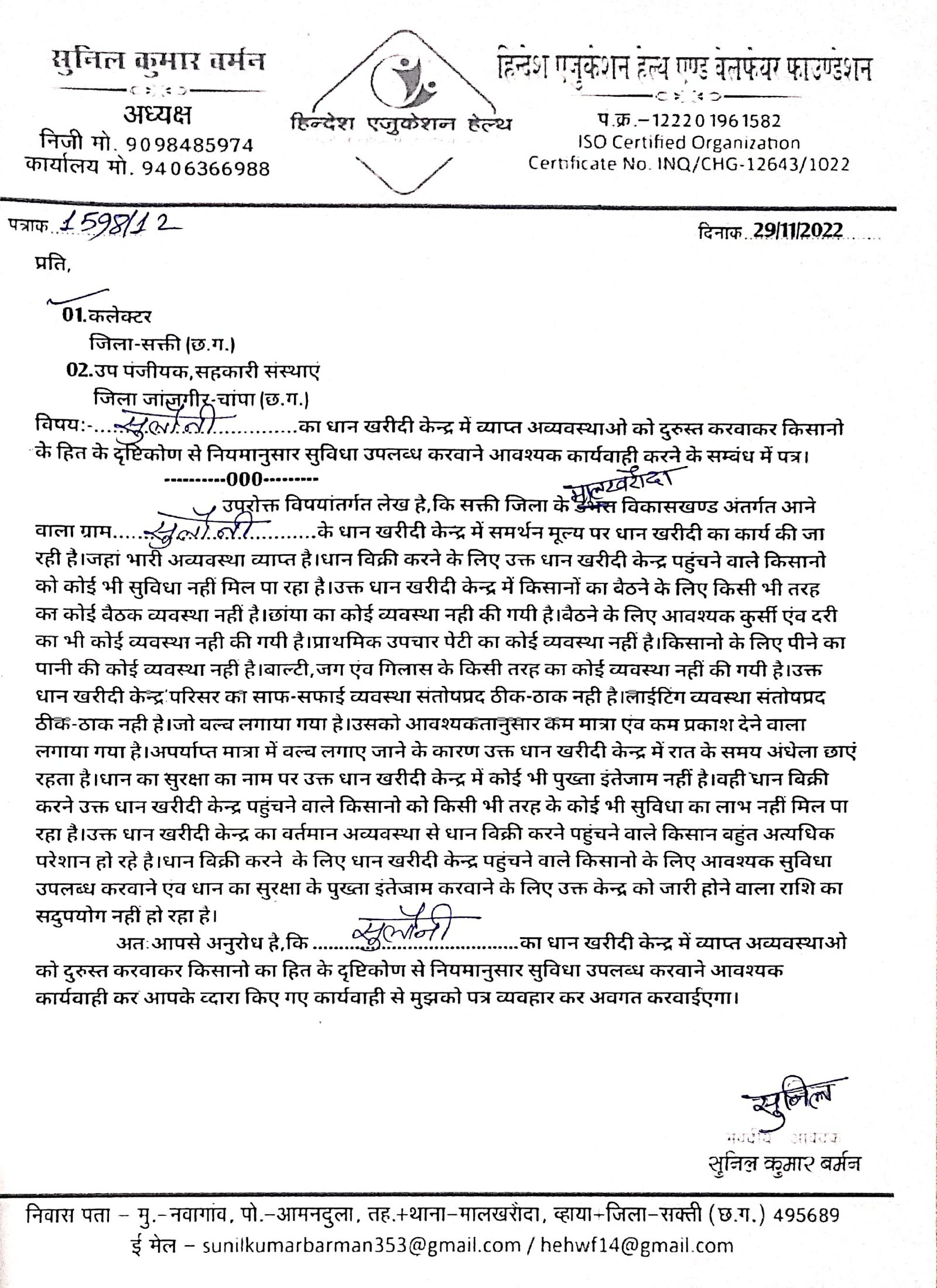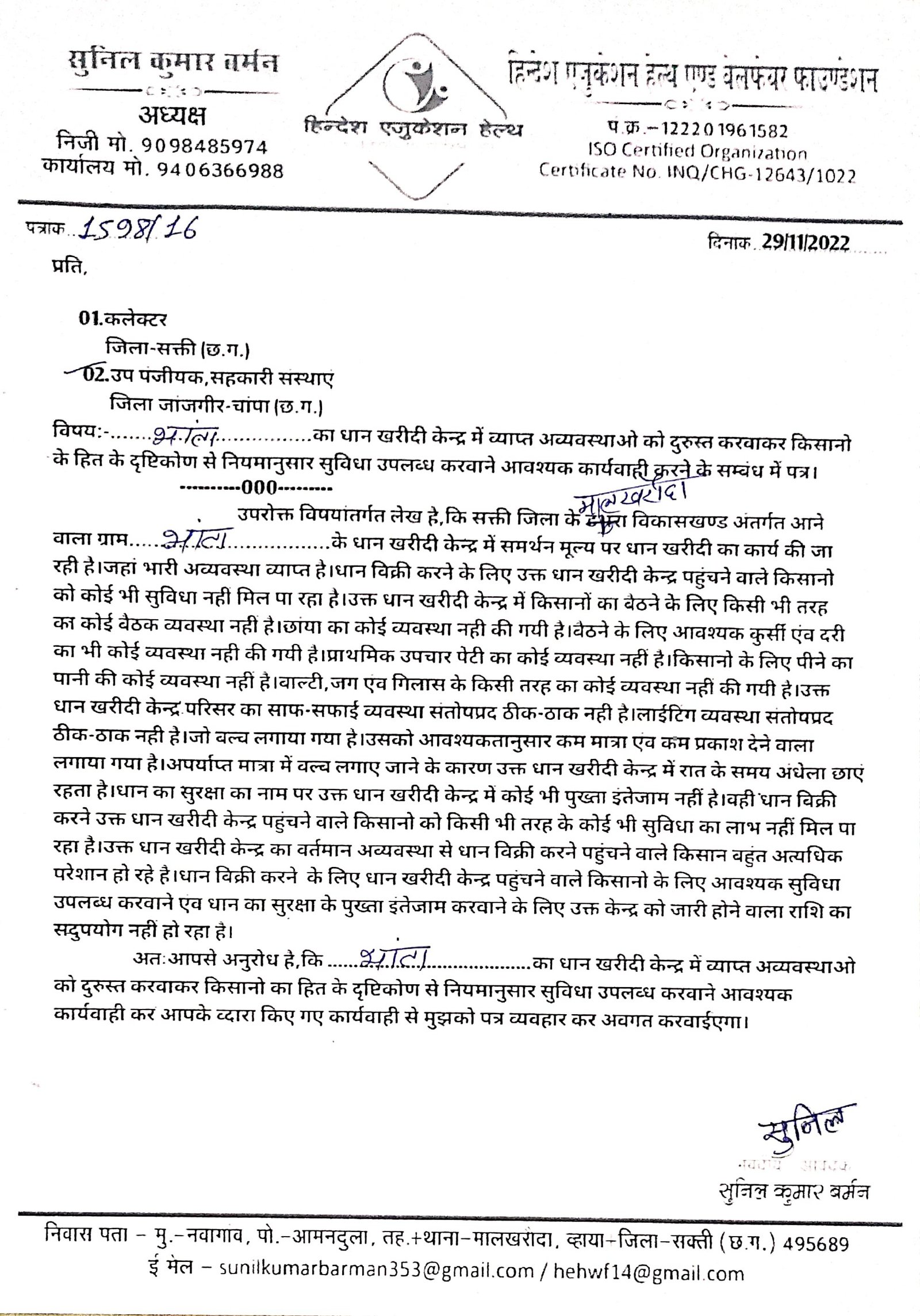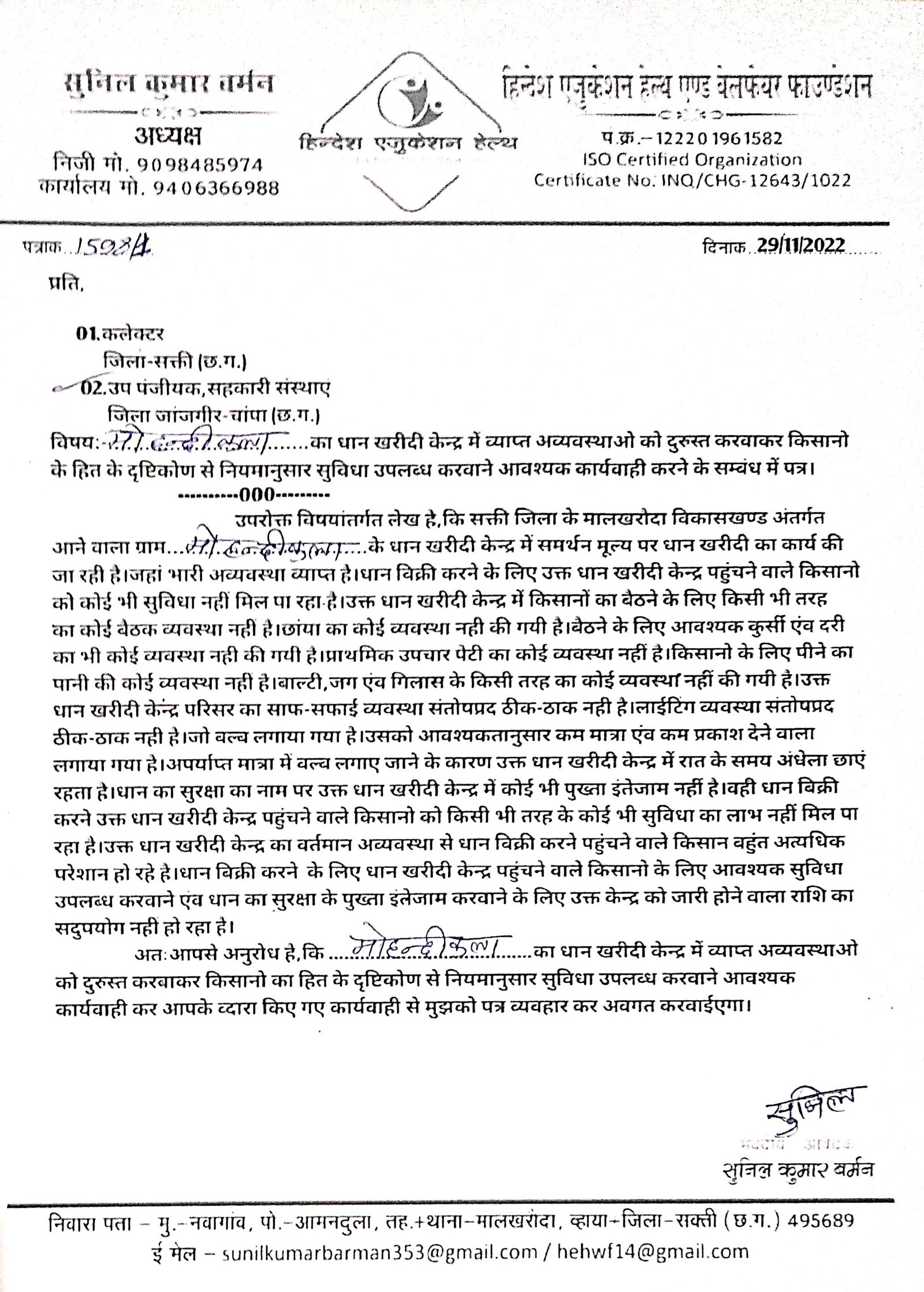 मालखरौदा-सक्ती(एचकेपी 24 न्यूज)।धान खरीदी केन्द्र मोहंदीकला,अडभार,सिंघरा,बुन्देली,पिरदा,घोघरी,आमनदुला,छपोरा,मुक्ता,मालखरौदा,बड़े पाडरमुडा,सुलौनी,करिगांव,पोता,लिमगांव,भांटा,कर्रापाली एंव जमगहन में मुलभूत सुविधाओ का अभाव होने के कारण धान खरीदी केन्द्र में धान बिक्री करने के लिए पहुंचने वाले किसानों को होने वाले समस्याओ का संज्ञान में आने पर हिन्देश एजुकेशन हेल्थ एण्ड वेलफेयर फाउण्डेशन (रजिस्टर्ड)के अध्यक्ष सुनिल कुमार बर्मन ने कलेक्टर एंव उप पंजीयक सहकारी संस्थाएं को किसानों का हित के दृष्टिकोण से आवश्यक कार्यवाही करने के लिए पत्र लिखा है।