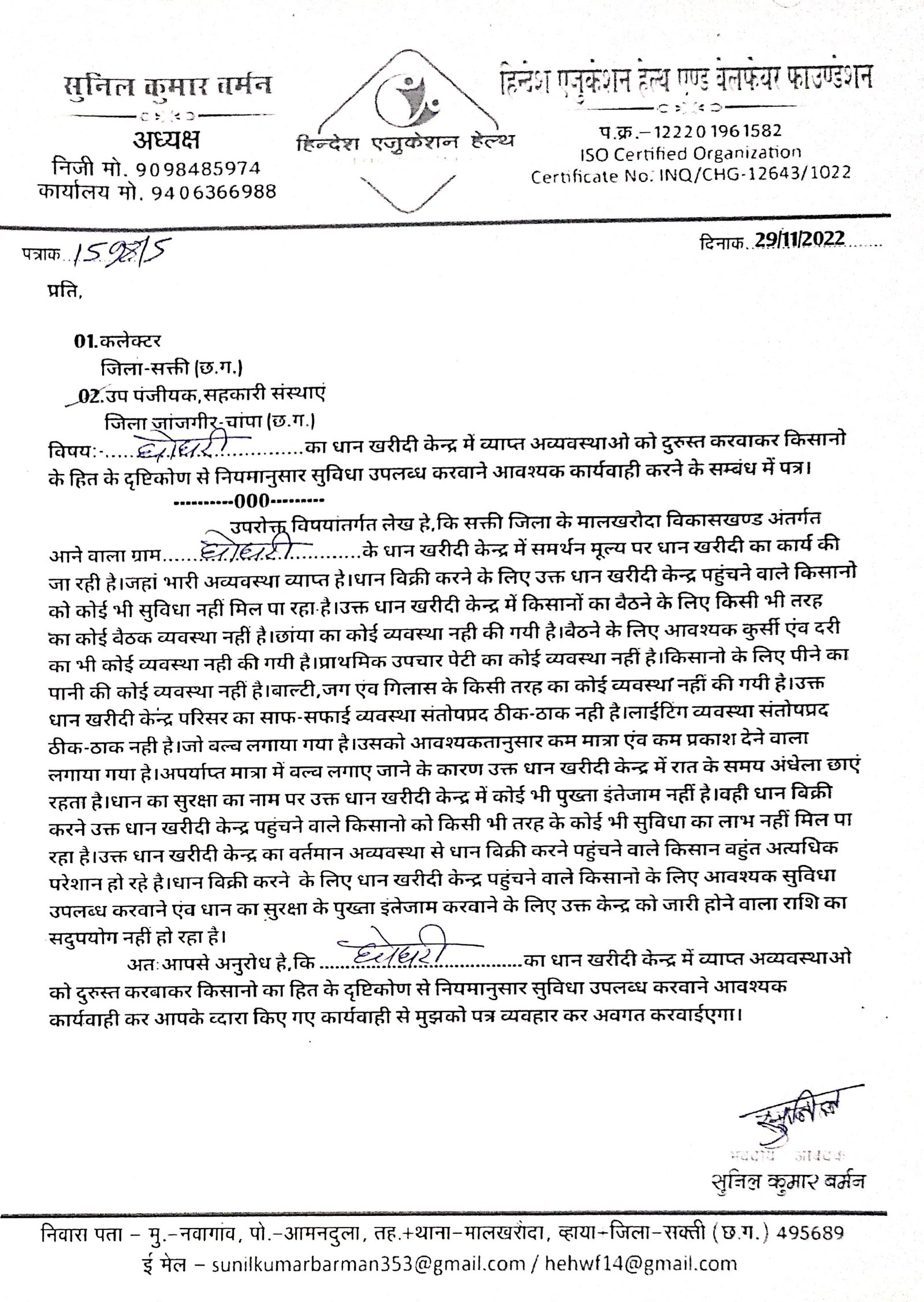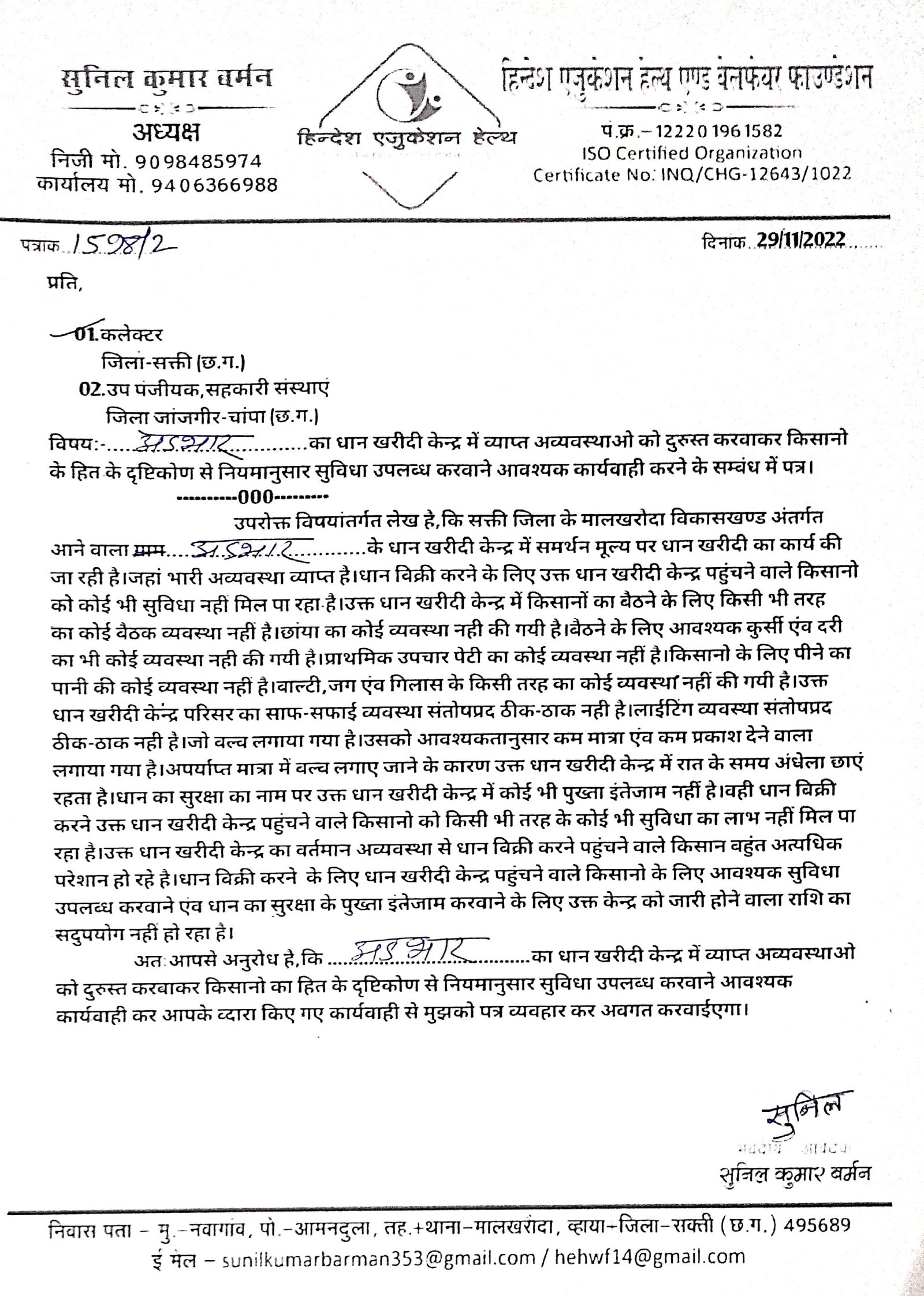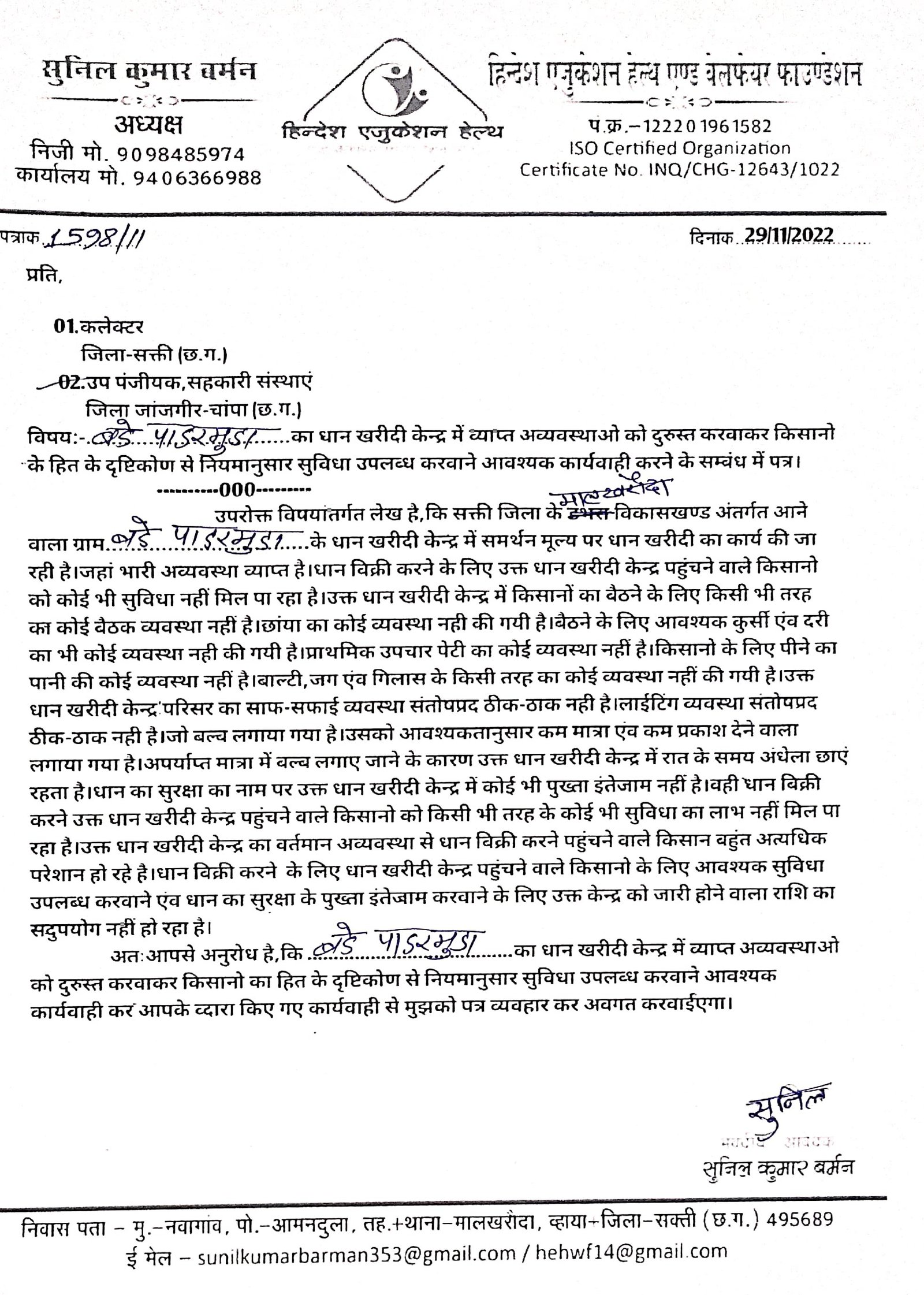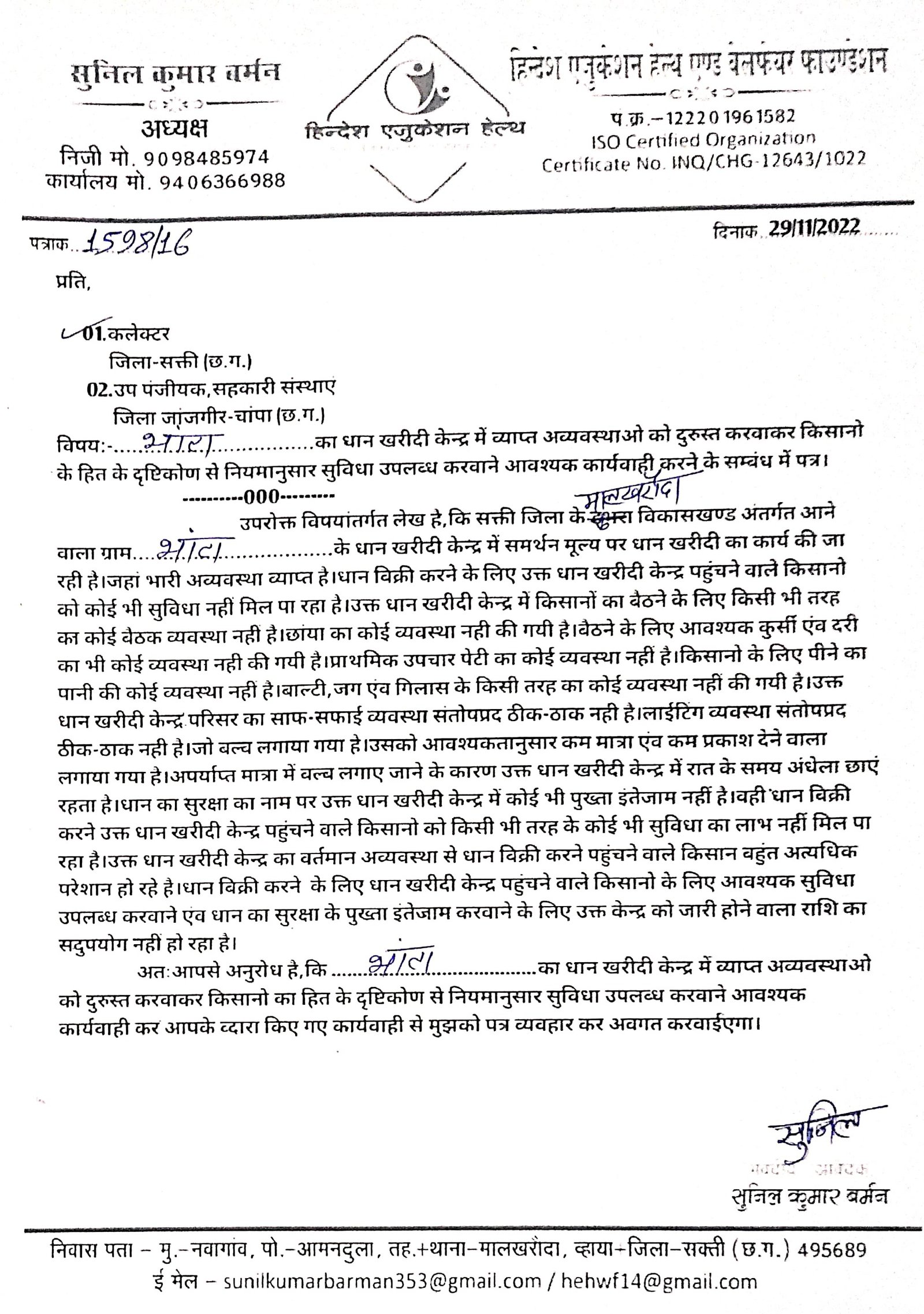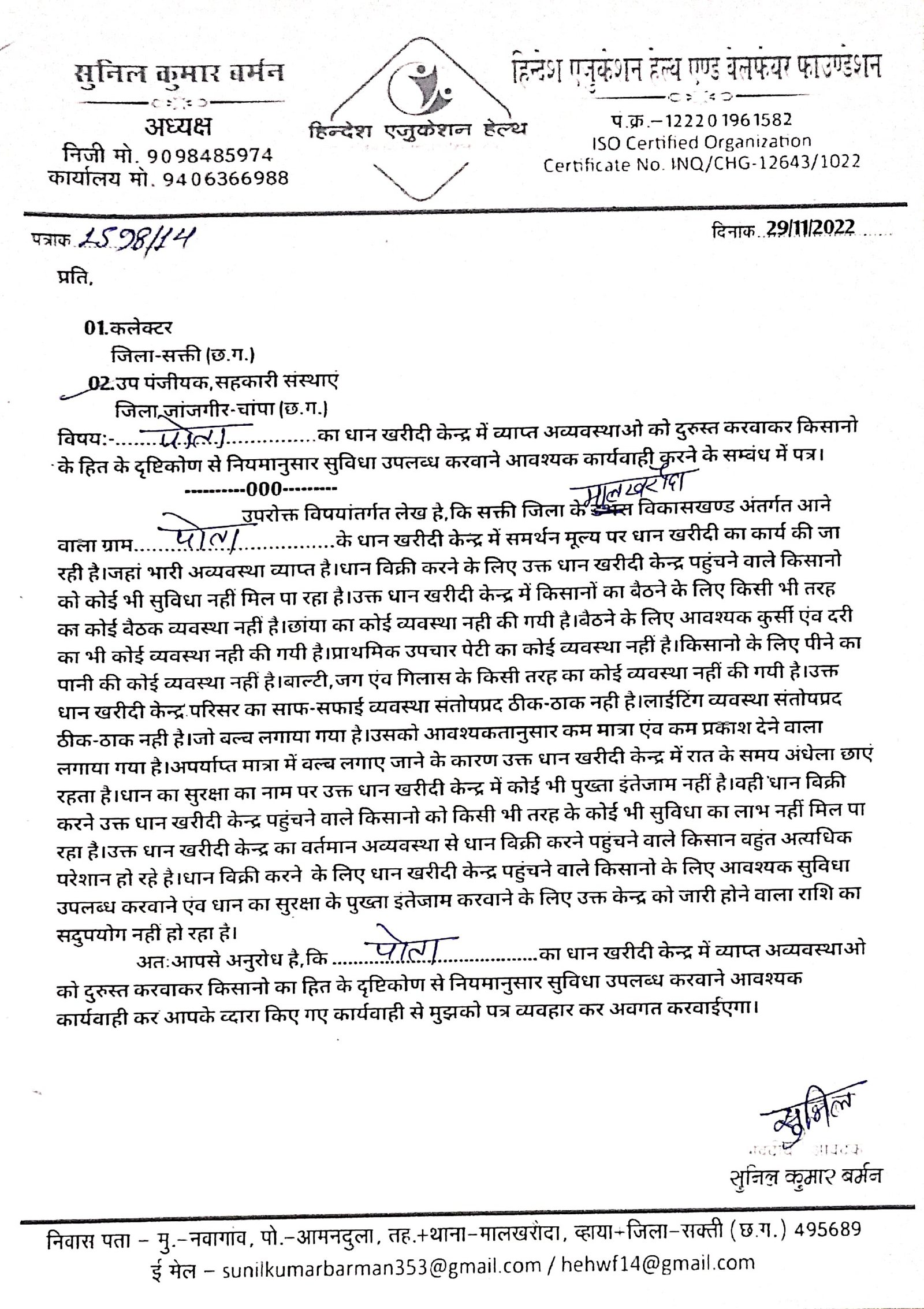 मालखरौदा-सक्ती(एचकेपी 24 न्यूज)।धान खरीदी केन्द्र मोहंदीकला,अडभार,सिंघरा,बुन्देली,पिरदा,घोघरी,आमनदुला,छपोरा,मुक्ता,मालखरौदा,बड़े पाडरमुडा,सुलौनी,करिगांव,पोता,लिमगांव,भांटा,कर्रापाली एंव जमगहन में मुलभूत सुविधाओ का अभाव होने के कारण धान खरीदी केन्द्र में धान बिक्री करने के लिए पहुंचने वाले किसानों को होने वाले समस्याओ का संज्ञान में आने पर हिन्देश एजुकेशन हेल्थ एण्ड वेलफेयर फाउण्डेशन (रजिस्टर्ड)के अध्यक्ष सुनिल कुमार बर्मन ने कलेक्टर एंव उप पंजीयक सहकारी संस्थाएं को किसानों का हित के दृष्टिकोण से आवश्यक कार्यवाही करने के लिए पत्र लिखा है।
