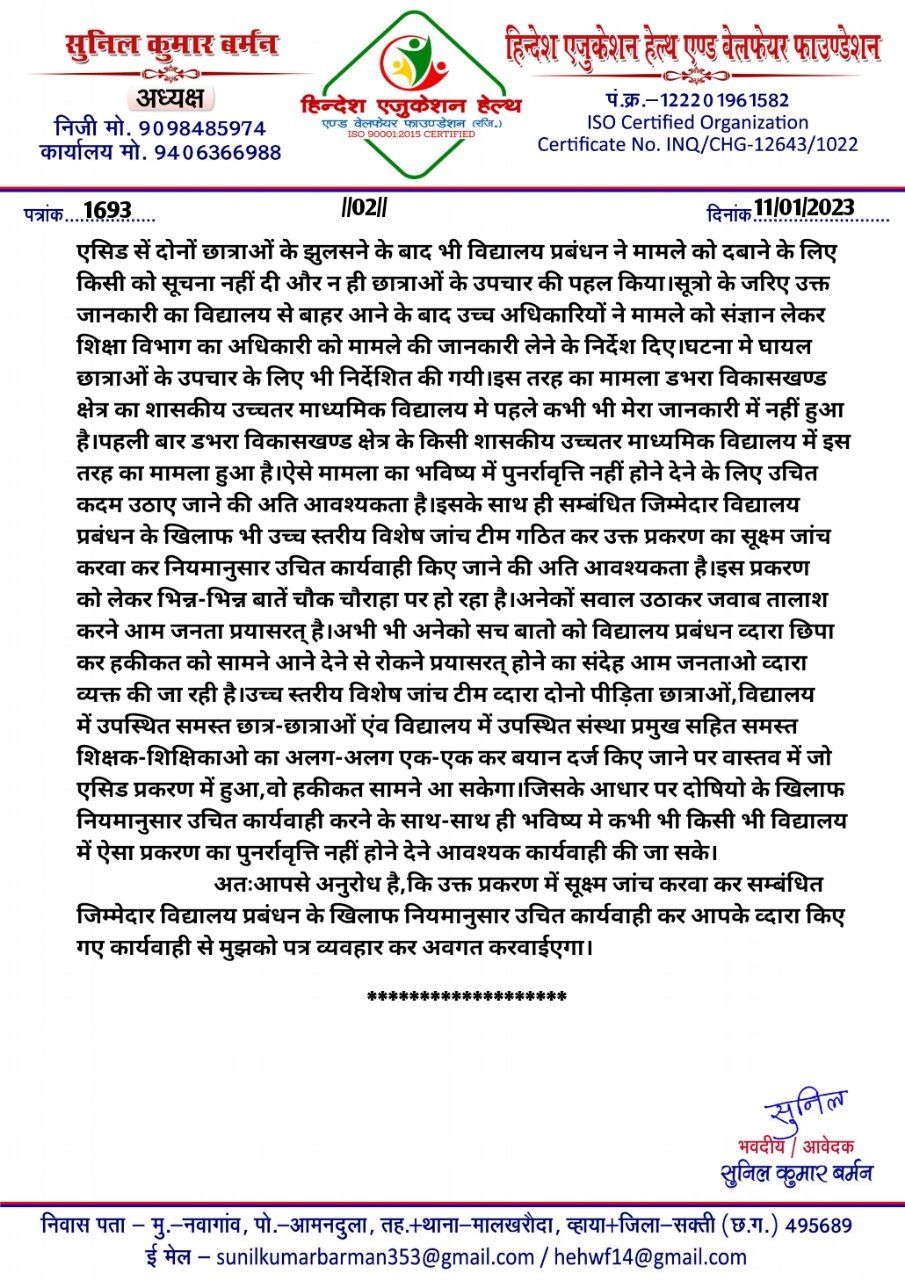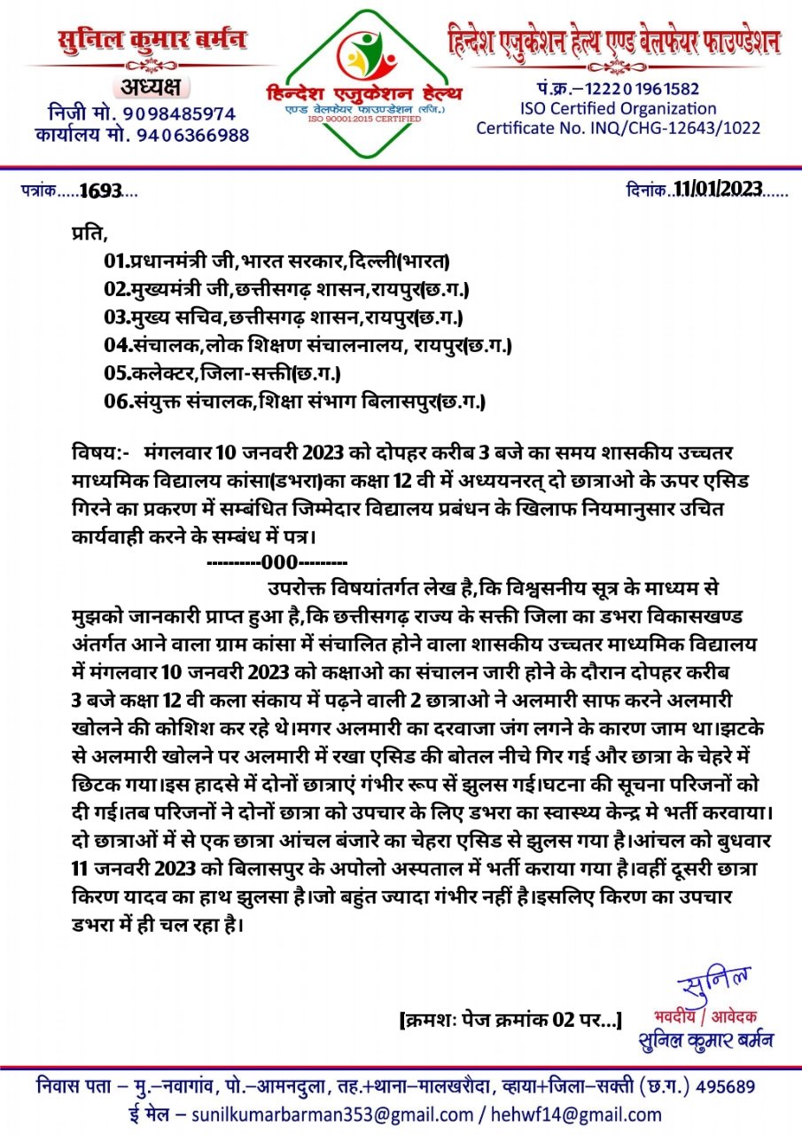 डभरा-सक्ती(एचकेपी 24 न्यूज)।मंगलवार 10 जनवरी 2022 को दोपहर करीब 3 बजे का समय शासकीय उच्चतर माध्यमिक विद्यालय कांसा(डभरा)का कक्षा 12 वी में अध्ययनरत् दो छात्राओ के ऊपर एसिड गिरने का प्रकरण में उच्च स्तरीय विशेष जांच टीम गठित कर सुक्ष्म जांच करवाते हुए सम्बंधित जिम्मेदार विद्यालय प्रबंधन के खिलाफ नियमानुसार उचित कार्यवाही करने एंव एसिड प्रकरण का भविष्य में किसी भी शासकीय विद्यालय में पुनर्रावृत्ति नहीं होने देने के लिए हिन्देश एजुकेशन हेल्थ एण्ड वेलफेयर फाउण्डेशन (रजिस्टर्ड) के अध्यक्ष सुनिल कुमार बर्मन ने पीएमओ, सीएमओ,सीएस,डीपीआई, कलेक्टर एंव जेडीई को पत्र लिखा है।श्री बर्मन शासन-प्रशासन को लिखे अपने पत्र में उल्लेख किया है कि लेख है,कि विश्वसनीय सूत्र के माध्यम से मुझको जानकारी प्राप्त हुआ है,कि छत्तीसगढ़ राज्य के सक्ती जिला का डभरा विकासखण्ड अंतर्गत आने वाला ग्राम कांसा में संचालित होने वाला शासकीय उच्चतर माध्यमिक विद्यालय में मंगलवार 10 जनवरी 2023 को कक्षाओ का संचालन जारी होने के दौरान दोपहर करीब 3 बजे कक्षा 12 वी कला संकाय में पढ़ने वाली 2 छात्राओ ने अलमारी साफ करने अलमारी खोलने की कोशिश कर रहे थे।मगर अलमारी का दरवाजा जंग लगने के कारण जाम था।झटके से अलमारी खोलने पर अलमारी में रखा एसिड की बोतल नीचे गिर गई और छात्रा के चेहरे में छिटक गया।इस हादसे में दोनों छात्राएं गंभीर रूप सें झुलस गई।घटना की सूचना परिजनों को दी गई।तब परिजनों ने दोनों छात्रा को उपचार के लिए डभरा का स्वास्थ्य केन्द्र मे भर्ती करवाया।दो छात्राओं में से एक छात्रा आंचल बंजारे का चेहरा एसिड से झुलस गया है।आंचल को बुधवार 11 जनवरी 2023 को बिलासपुर के अपोलो अस्पताल में भर्ती कराया गया है।वहीं दूसरी छात्रा किरण यादव का हाथ झुलसा है।जो बहुंत ज्यादा गंभीर नहीं है।इसलिए किरण का उपचार डभरा में ही चल रहा है।एसिड सें दोनों छात्राओं के झुलसने के बाद भी विद्यालय प्रबंधन ने मामले को दबाने के लिए किसी को सूचना नहीं दी और न ही छात्राओं के उपचार की पहल किया।सूत्रो के जरिए उक्त जानकारी का विद्यालय से बाहर आने के बाद उच्च अधिकारियों ने मामले को संज्ञान लेकर शिक्षा विभाग का अधिकारी को मामले की जानकारी लेने के निर्देश दिए।घटना मे घायल छात्राओं के उपचार के लिए भी निर्देशित की गयी।इस तरह का मामला डभरा विकासखण्ड क्षेत्र का शासकीय उच्चतर माध्यमिक विद्यालय मे पहले कभी भी मेरा जानकारी में नहीं हुआ है।पहली बार डभरा विकासखण्ड क्षेत्र के किसी शासकीय उच्चतर माध्यमिक विद्यालय में इस तरह का मामला हुआ है।ऐसे मामला का भविष्य में पुनर्रावृत्ति नहीं होने देने के लिए उचित कदम उठाए जाने की अति आवश्यकता है।इसके साथ ही सम्बंधित जिम्मेदार 