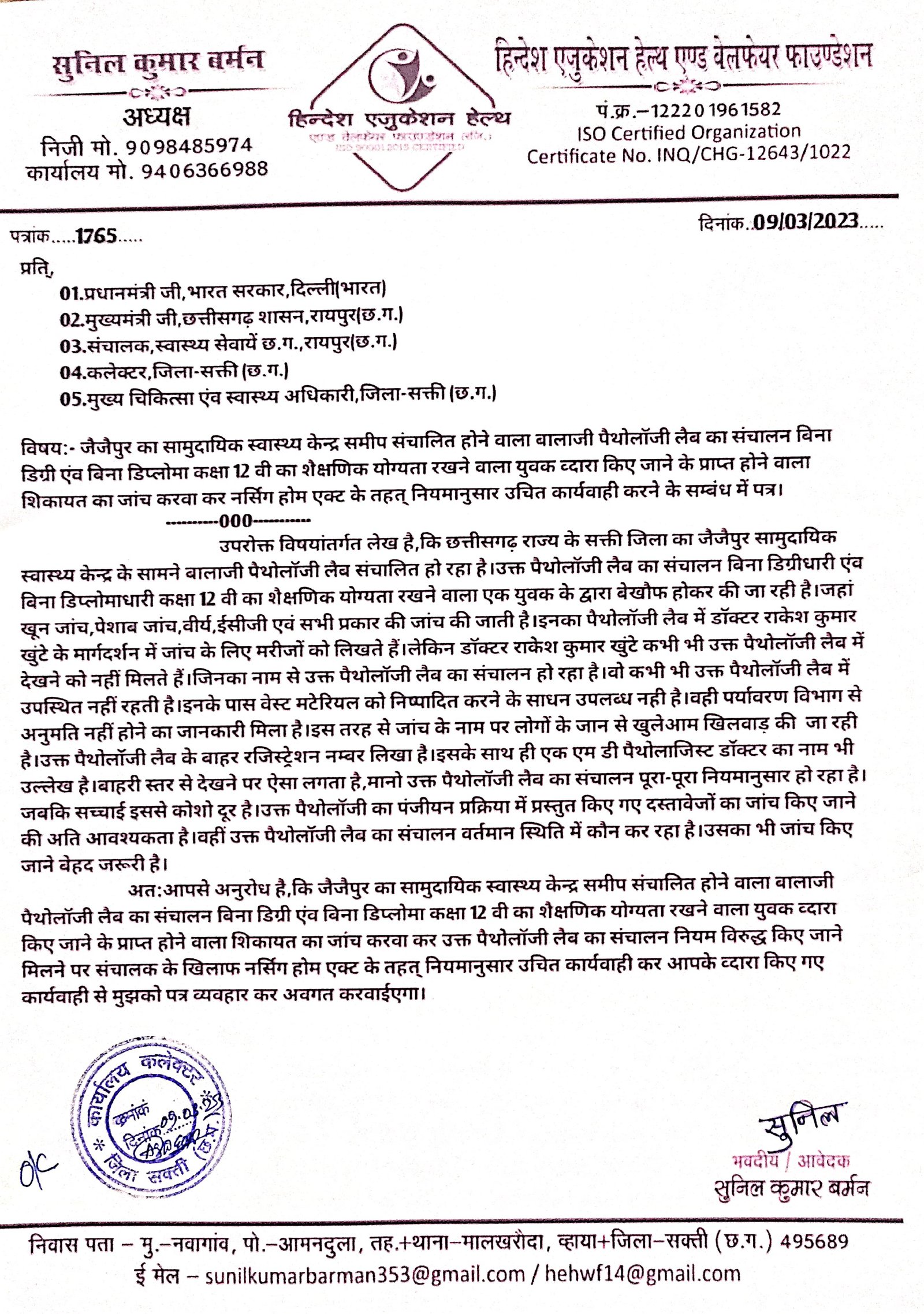 जैजैपुर-सक्ती(एचकेपी 24 न्यूज)।सामुदायिक स्वास्थ्य केन्द्र जैजैपुर का समीप बिना डिग्री एंव बिना डिप्लोमा कक्षा 12 वी पास युवक व्दारा बालाजी पैथोलॉजी लैब का संचालन किए जाने का लगातार प्राप्त होने वाला शिकायत का जांच करवाकर नर्सिंग होम एक्ट के तहत् नियमानुसार उचित कार्यवाही करने के लिए हिन्देश एजुकेशन हेल्थ एण्ड वेलफेयर फाउण्डेशन(रजिस्टर्ड) के अध्यक्ष सुनिल कुमार बर्मन ने पीएमओ,सीएमओ,संचालक स्वास्थ्य सेवायें,कलेक्टर एंव सीएमएचओ को पत्र लिखा है।