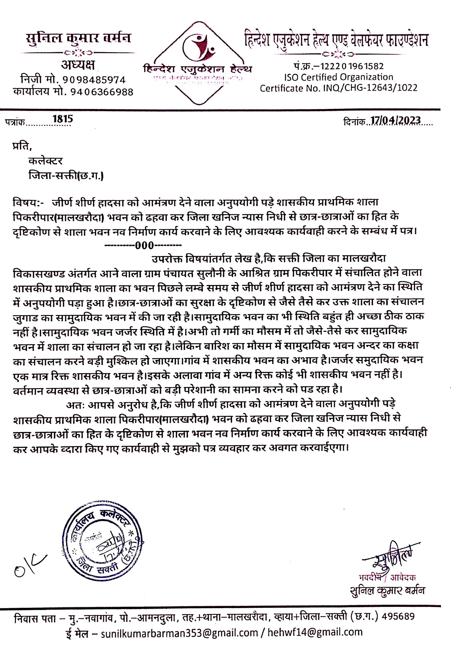 मालखरौदा-सक्ती(एचकेपी 24 न्यूज)।शासकीय प्राथमिक शाला पिकरीपार का भवन के जीर्ण जीर्ण अवस्था में पहुंचने पर शाला का संचालन सामुदायिक भवन में जारी है।छात्र-छात्राओं का हित के दृष्टिकोण से जिला खनिज न्यास मद से नवीन शाला भवन निर्माण कार्य करवाने आवश्यक कार्यवाही करने हिन्देश एजुकेशन हेल्थ एण्ड वेलफेयर फाउण्डेशन (रजिस्टर्ड)के अध्यक्ष सुनिल कुमार बर्मन ने कलेक्टर को पत्र लिखा है।