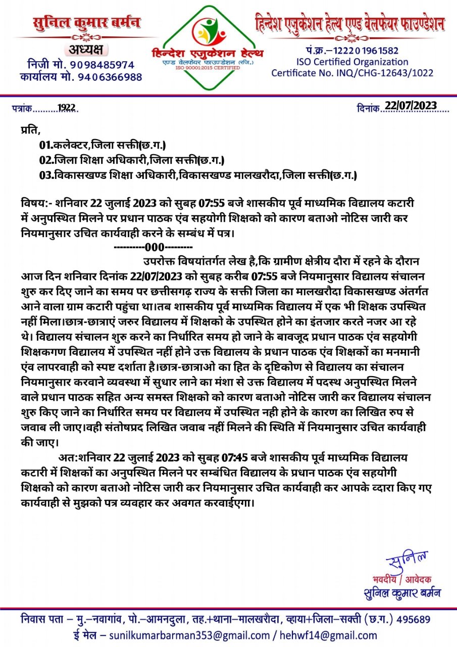 मालखरौदा-सक्ती(एचकेपी 24 न्यूज)।शनिवार 22 जुलाई 2023 को सुबह 07:55 बजे कटारी के शासकीय पूर्व माध्यमिक विद्यालय में अनुपस्थित मिले प्रधान पाठक सहित समस्त सहयोगी शिक्षकगण,छात्र-छात्राएं शिक्षको के विद्यालय आने का इंतजार करते नजर आए,छात्र-छात्राओं का हित के दृष्टिकोण से हिन्देश एजुकेशन हेल्थ एण्ड वेलफेयर फाउण्डेशन (रजिस्टर्ड) के अध्यक्ष सुनिल कुमार बर्मन ने कलेक्टर,डीईओ एंव बीईओ को लापरवाही मनमानी करने वाले शिक्षको को कारण बताओ नोटिस जारी करते हुए उचित कार्यवाही करने के लिए पत्र लिखा है।