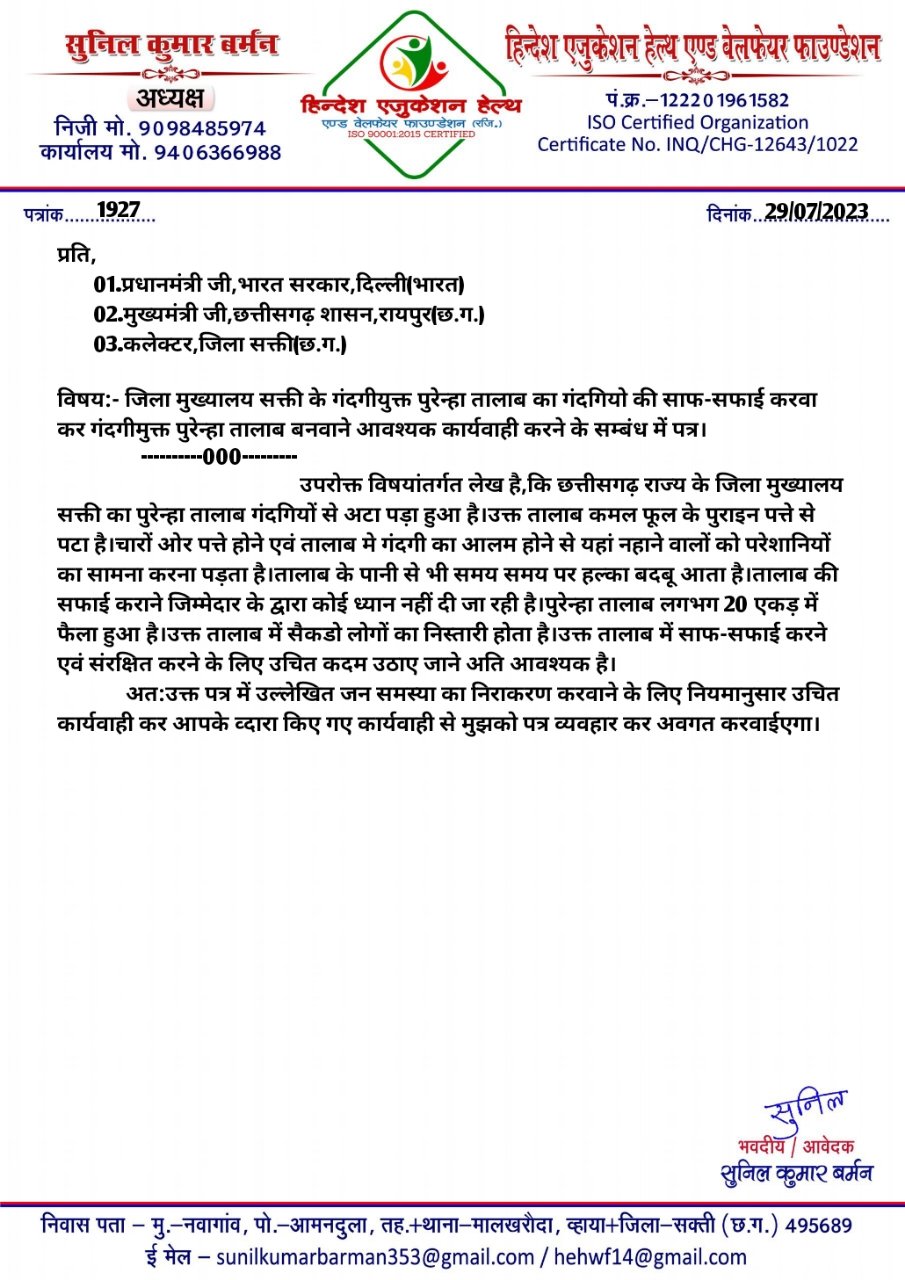 सक्ती(एचकेपी 24 न्यूज)।जिला मुख्यालय का पुरेन्हा तालाब कमल फूल का पुराइन पत्ता से पटा हुआ है।तालाब में नहाने वाले लोग परेशान हो रहे हैं।पुरेन्हा तालाब का आवश्यक साफ सफाई कार्य करवाने हिन्देश एजुकेशन हेल्थ एण्ड वेलफेयर फाउण्डेशन (रजिस्टर्ड) के अध्यक्ष सुनिल कुमार बर्मन ने पीएमओ,सीएमओ एंव कलेक्टर को पत्र लिखा है।