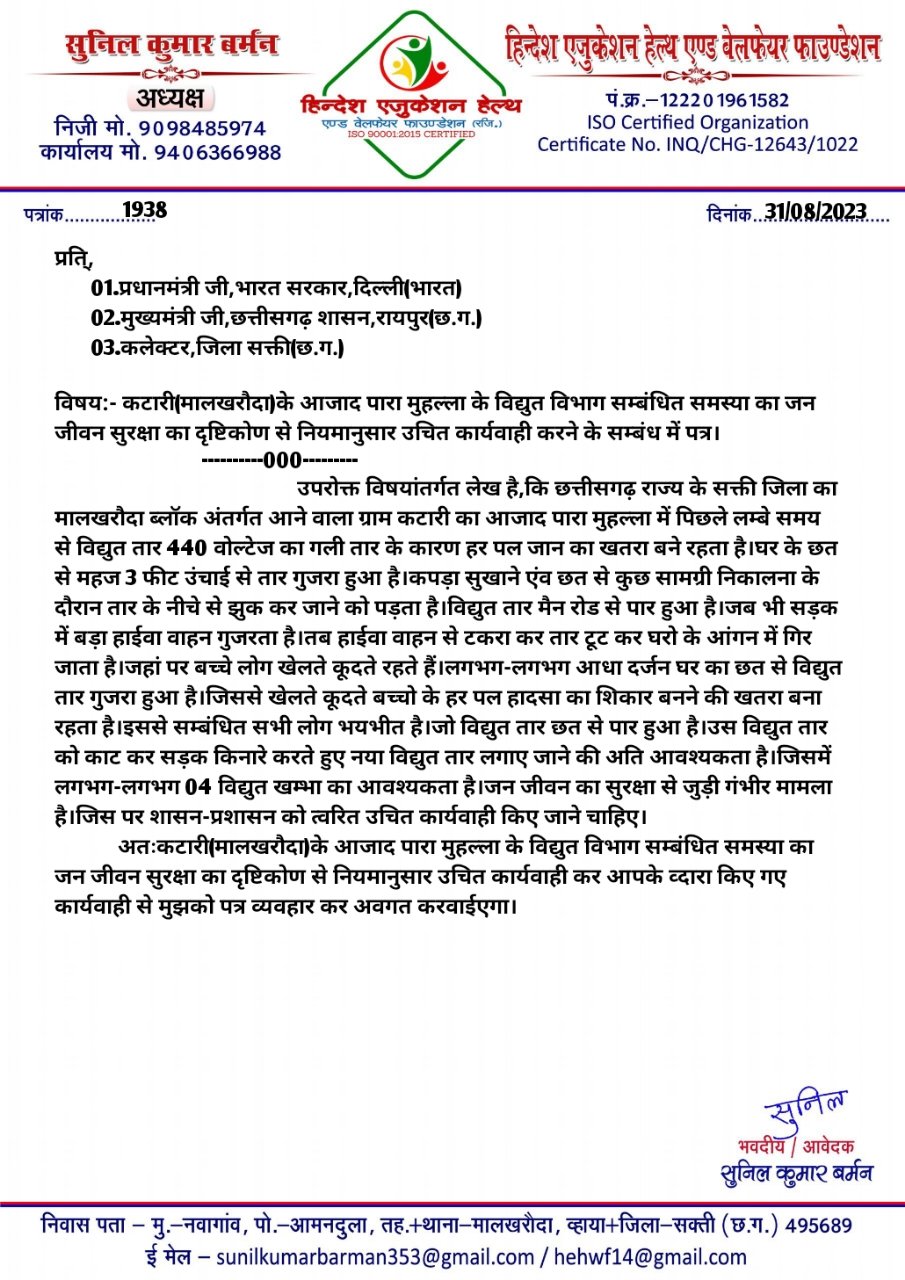 मालखरौदा-सक्ती(एचकेपी 24 न्यूज)।ग्राम कटारी का आजाद पारा मुहल्ला के लगभग-लगभग आधा दर्जन घर का छत ऊपर से करंटयुक्त विद्युत तार के गुजरने से हर पल बड़ा हादसा होने का संभावना के जन जीवन सुरक्षा से जुड़े गंभीर मामला का संज्ञान में आने पर तत्काल हिन्देश एजुकेशन हेल्थ एण्ड वेलफेयर फाउण्डेशन (रजिस्टर्ड) के अध्यक्ष सुनिल कुमार बर्मन ने पीएमओ,सीएमओ एंव कलेक्टर को त्वरित जन जीवन सुरक्षा का दृष्टिकोण से करंटयुक्त विद्युत तार को घर का छत ऊपर से हटवाने आवश्यक कार्यवाही करने के लिए पत्र लिखा है।